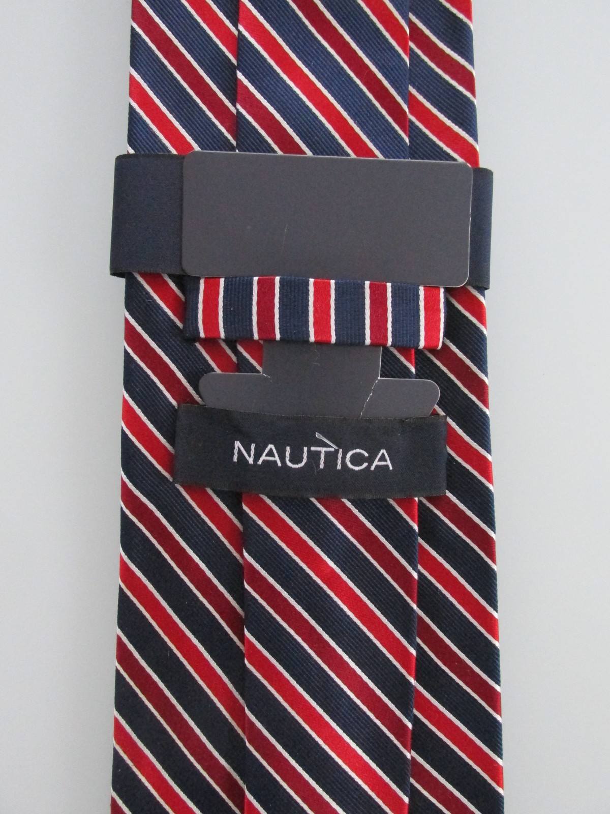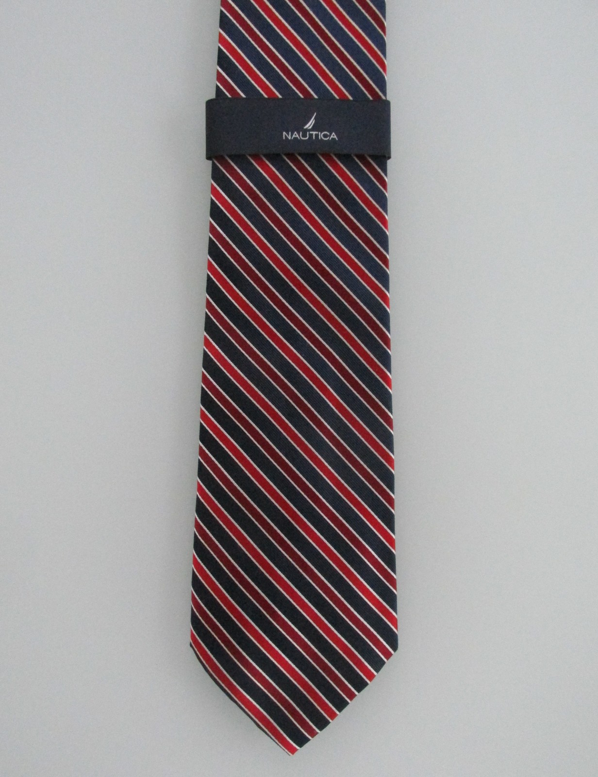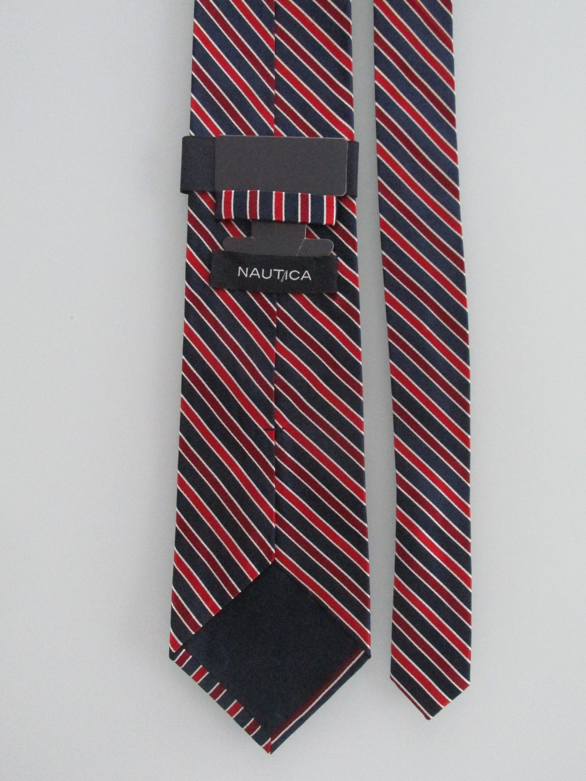 Description: Up for sale is a Nautica (NWT) men's silk tie. This tie is made of 100% silk. The tie has a multicolored striped design in blue, red white. Dimensions are approximately 58" long x 3 5/8" wide.