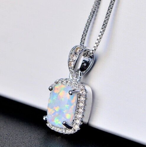 2Ct Cushion Cut Fire Opal Women's Halo Pendant 14K White Gold Finish Free Chain