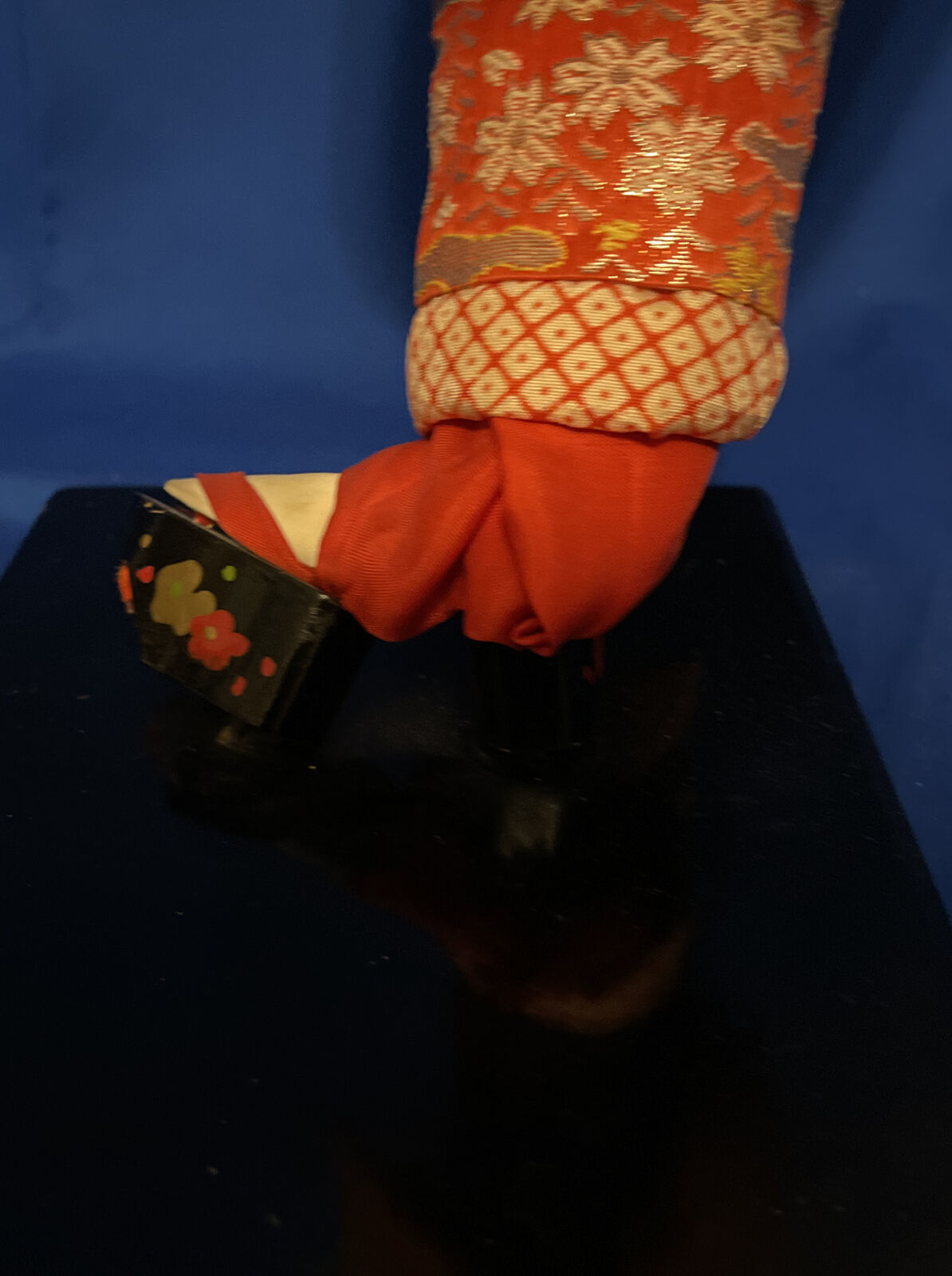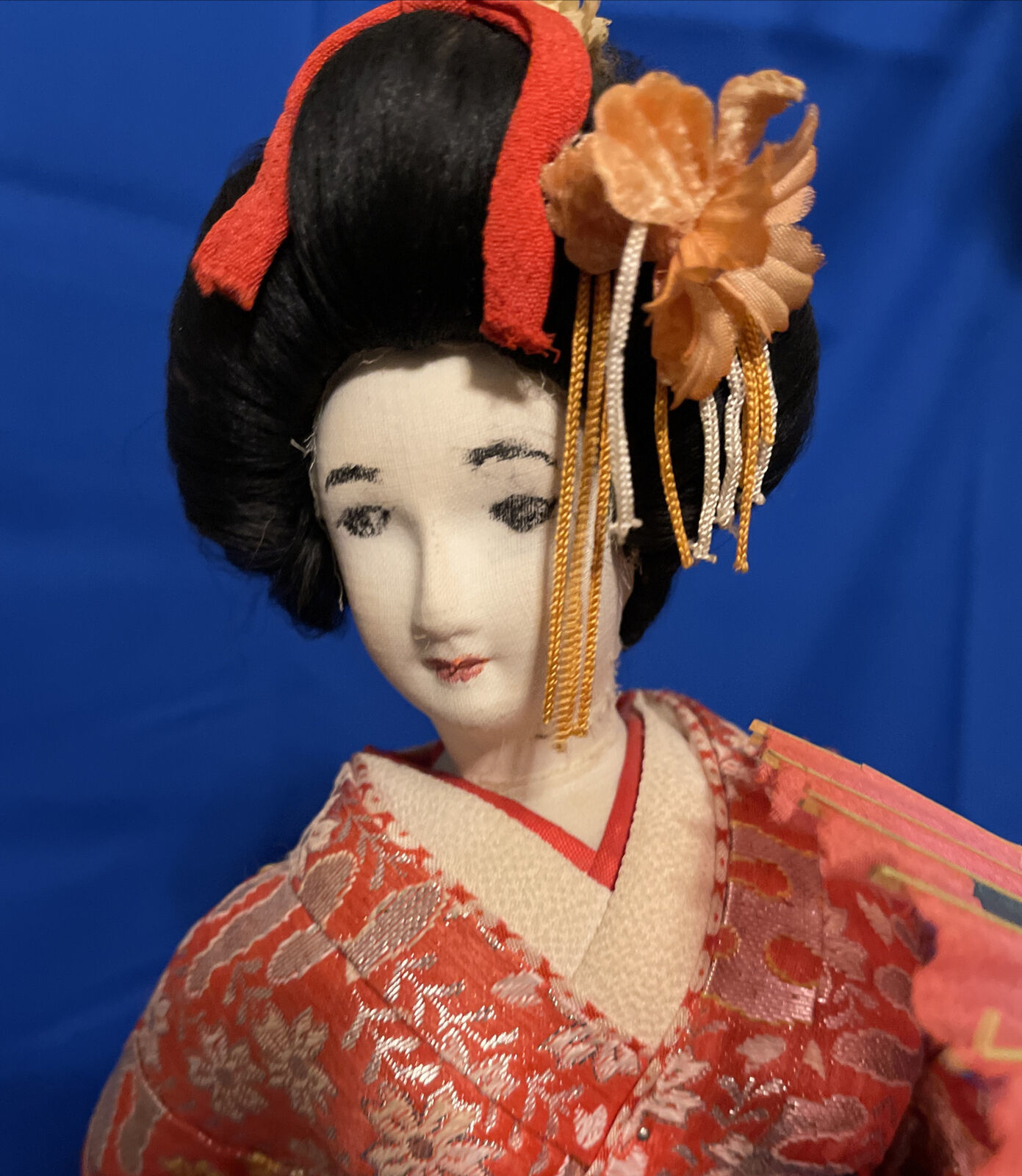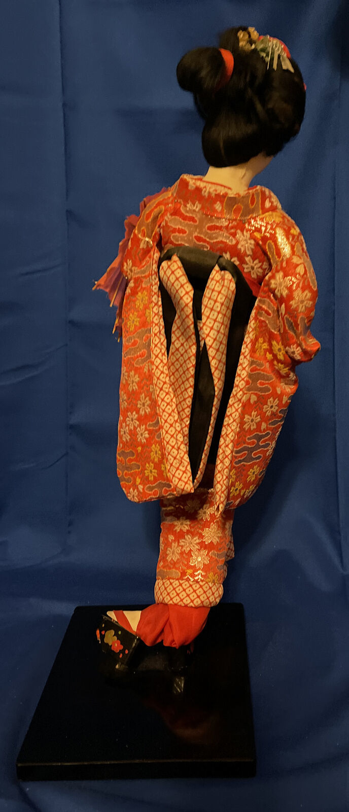 Vintage Japanese Geisha Doll Kimono on Wood Platform 17" Tall
