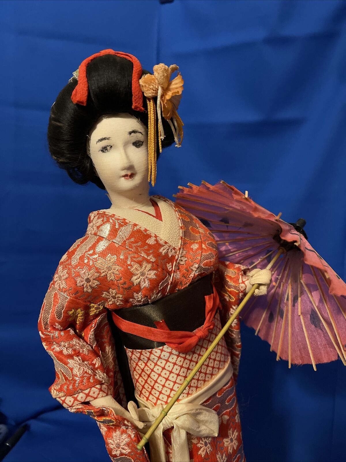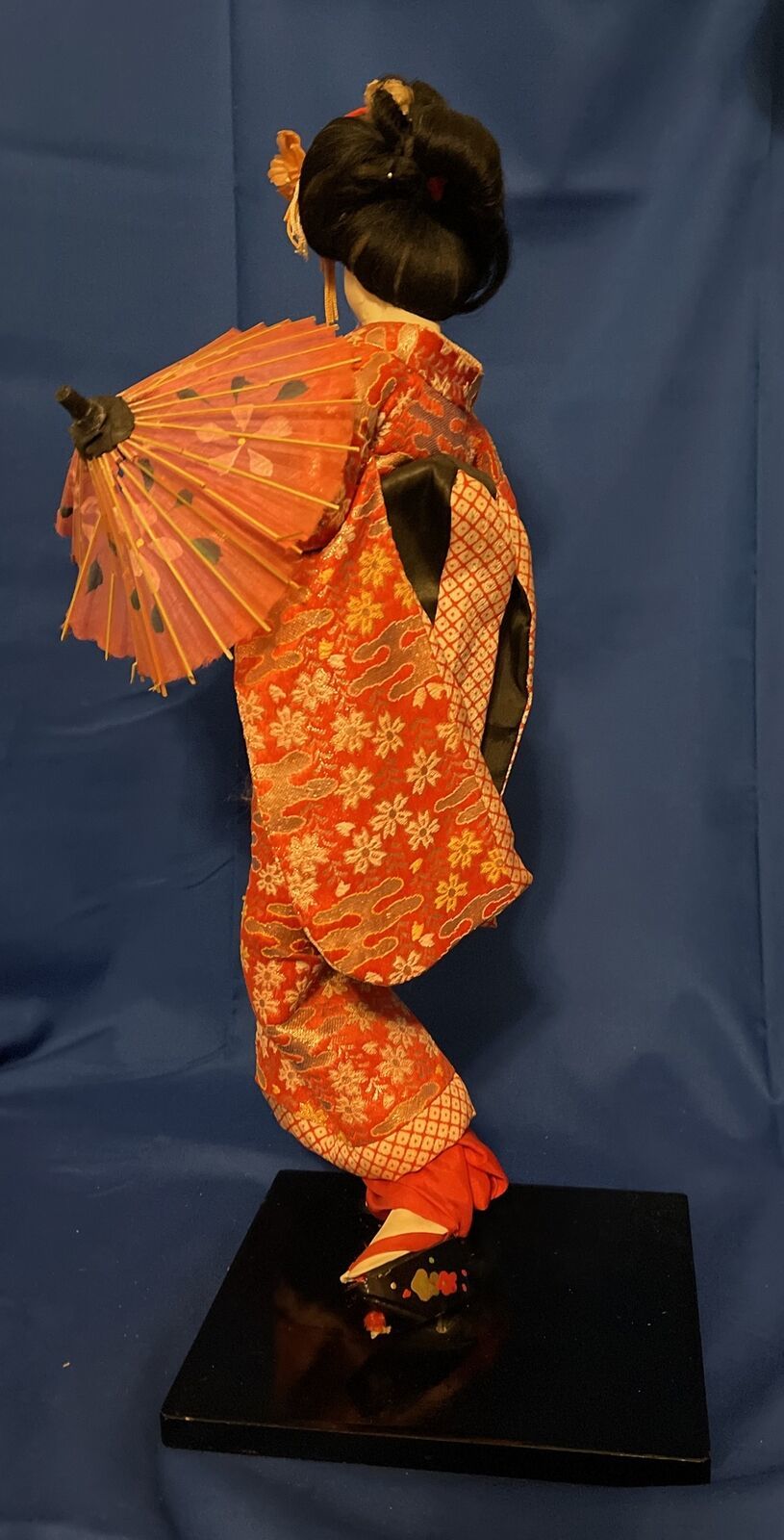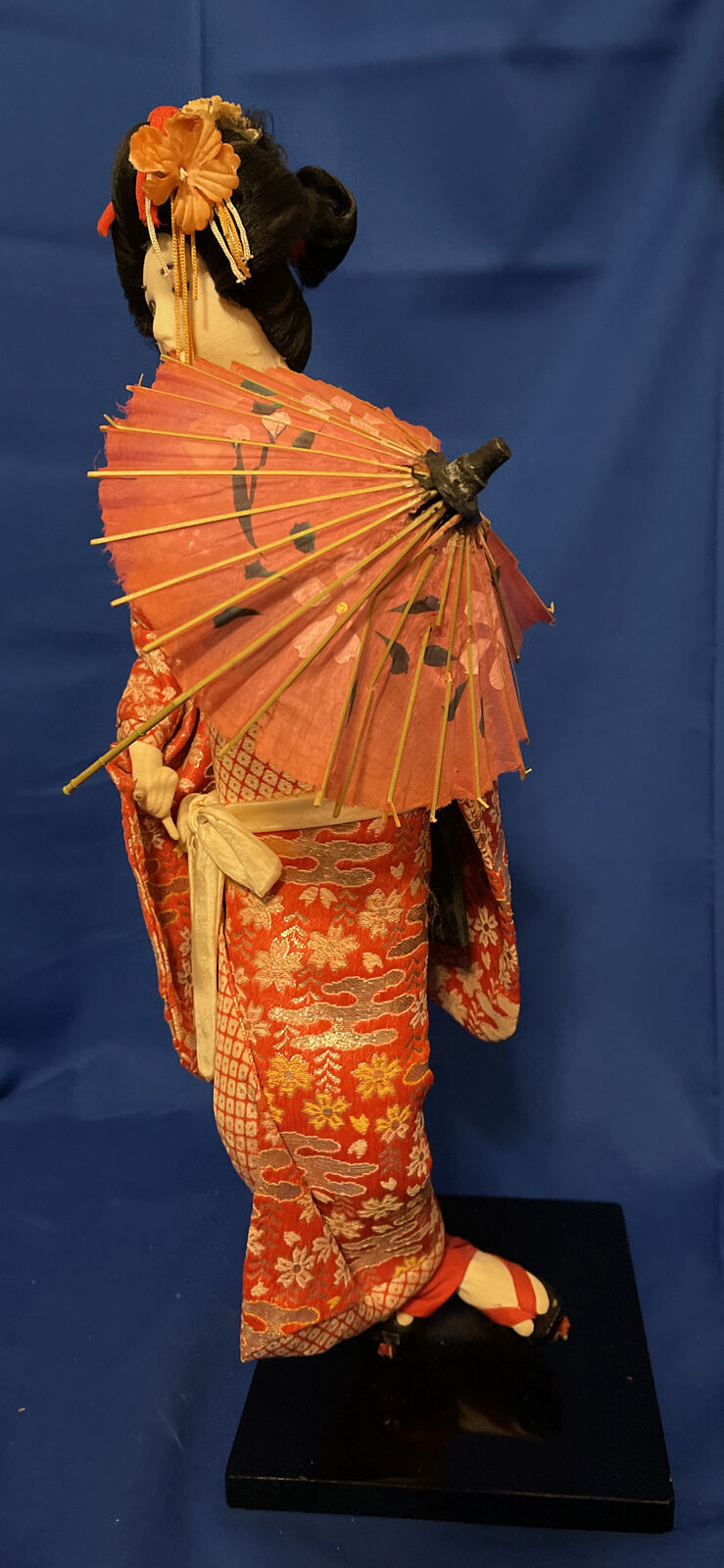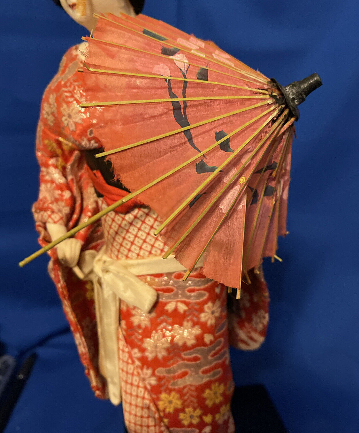 Doll came from Japan. Overall good pre-owned condition. She is attached to a wood stand. Body is cloth. Umbrella appears to be very delicate - will do my best to secure during shipping.