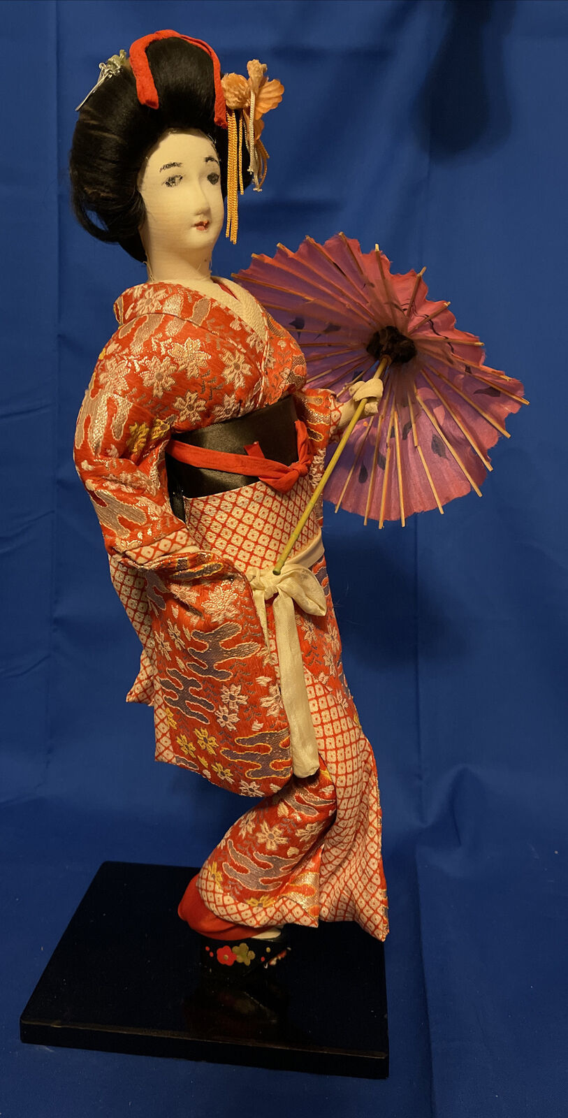 Vintage Japanese Geisha Doll Kimono on Wood Platform 17" Umbrella
