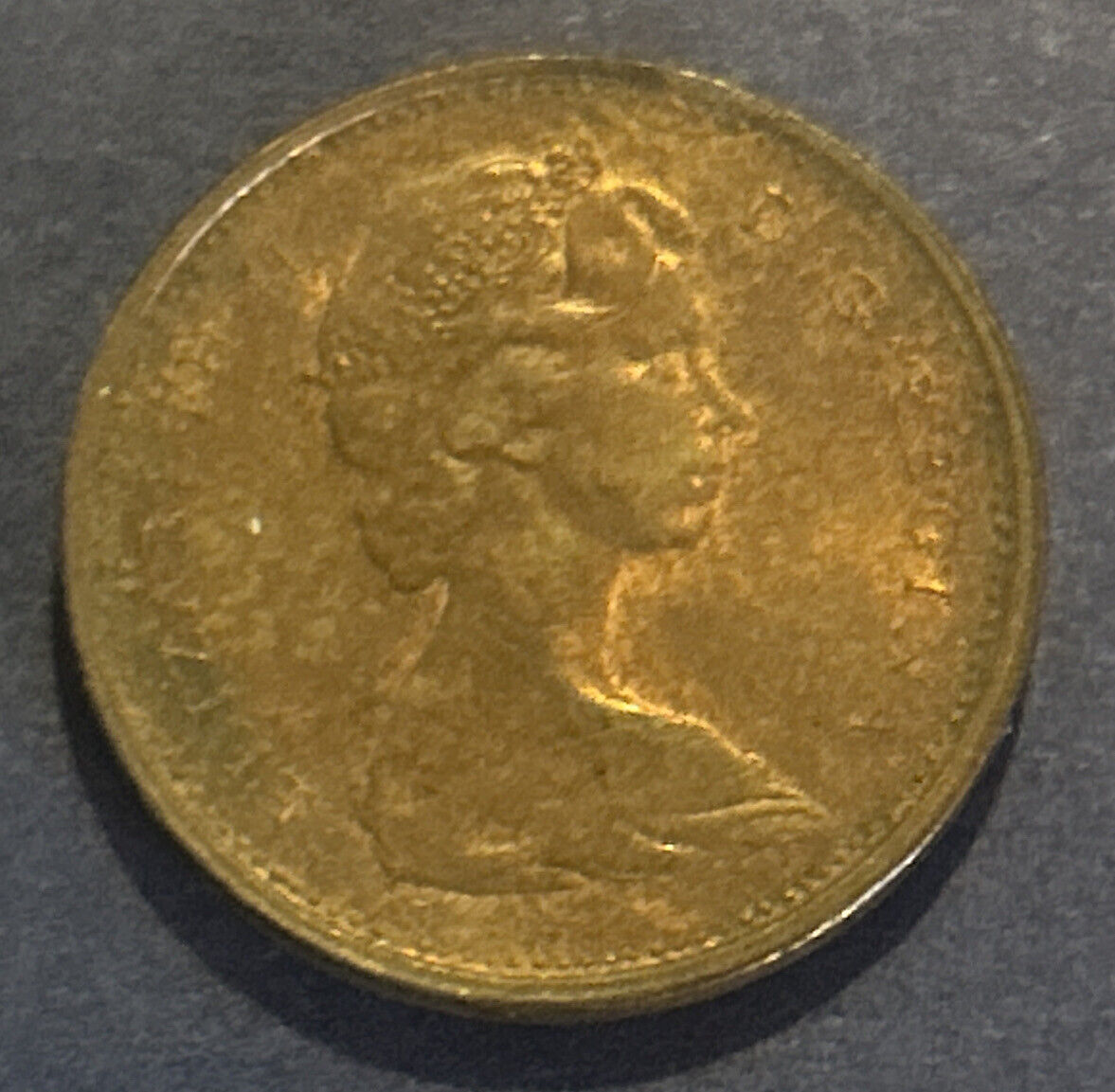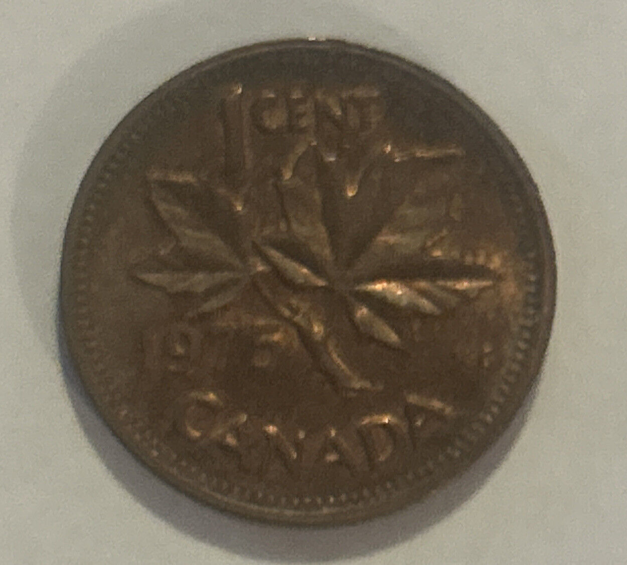 1975 CANADIAN ONE CENT Collectible Coin. Color of coin is best shown with the white background. Extra lighting on the blue background to show detail.