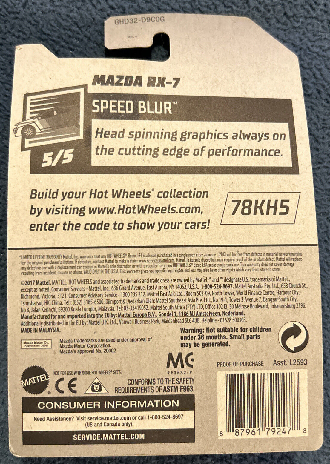 Get your motors running with this vibrant orange Hot Wheels car! This diecast Mazda RX-7 from the Speed Blur series is a must-have for car enthusiasts and collectors alike. This 1:64 scale car is unopened and comes in its original box, making it a perfect gift for any occasion.