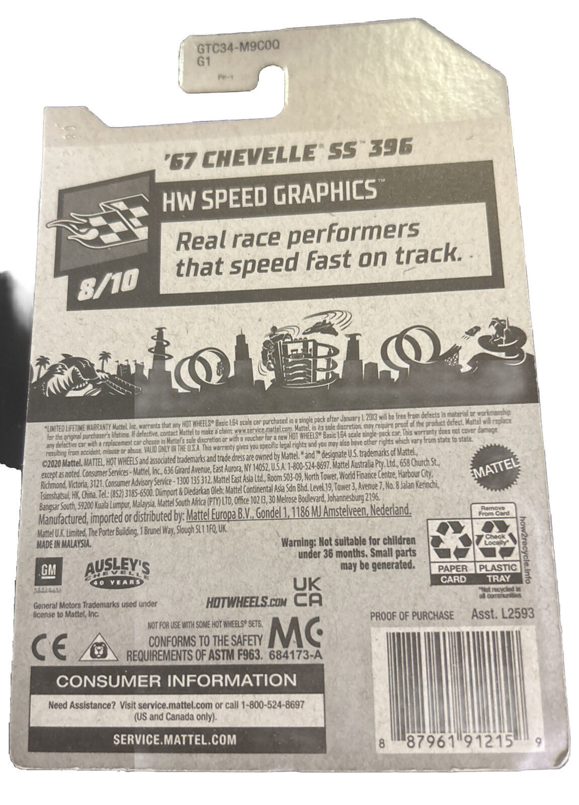 For all the car enthusiasts out there, we have an amazing Hot Wheels diecast car up for grabs. This 1:64 scale model of a '67 Chevelle SS 396 is a must-have for any Hot Wheels collector. The car comes in an unopened box and is a part of the HW Speed Graphics series.