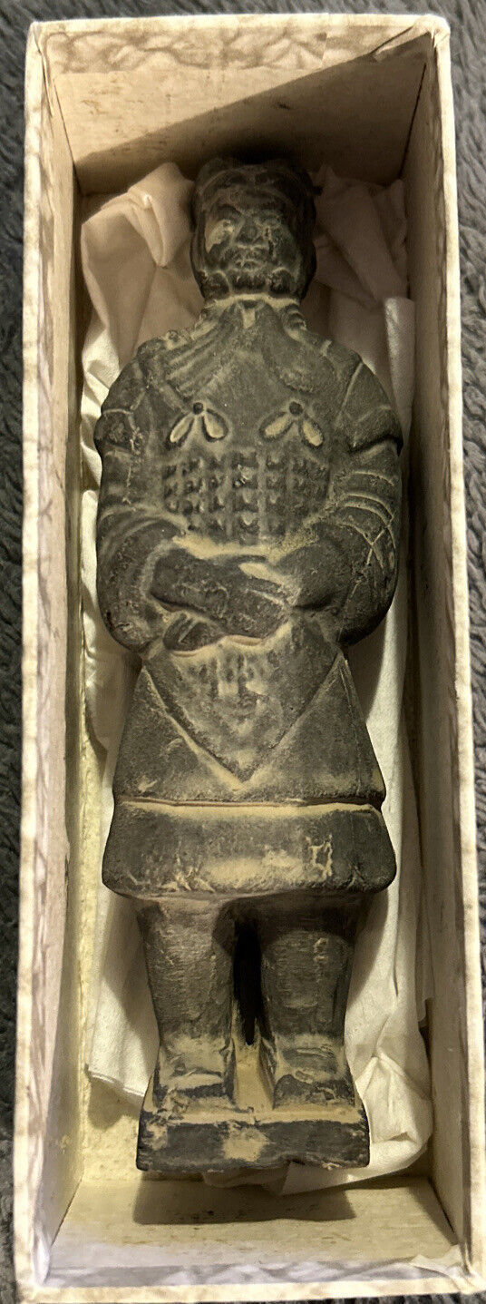 This antique Asian terra cotta warrior figurine is a stunning piece of art that will surely capture the attention of any collector. The intricately crafted black porcelain and pottery statue depicts a warrior and is believed to be a reproduction of the army of Qin Shi Huang soldiers.