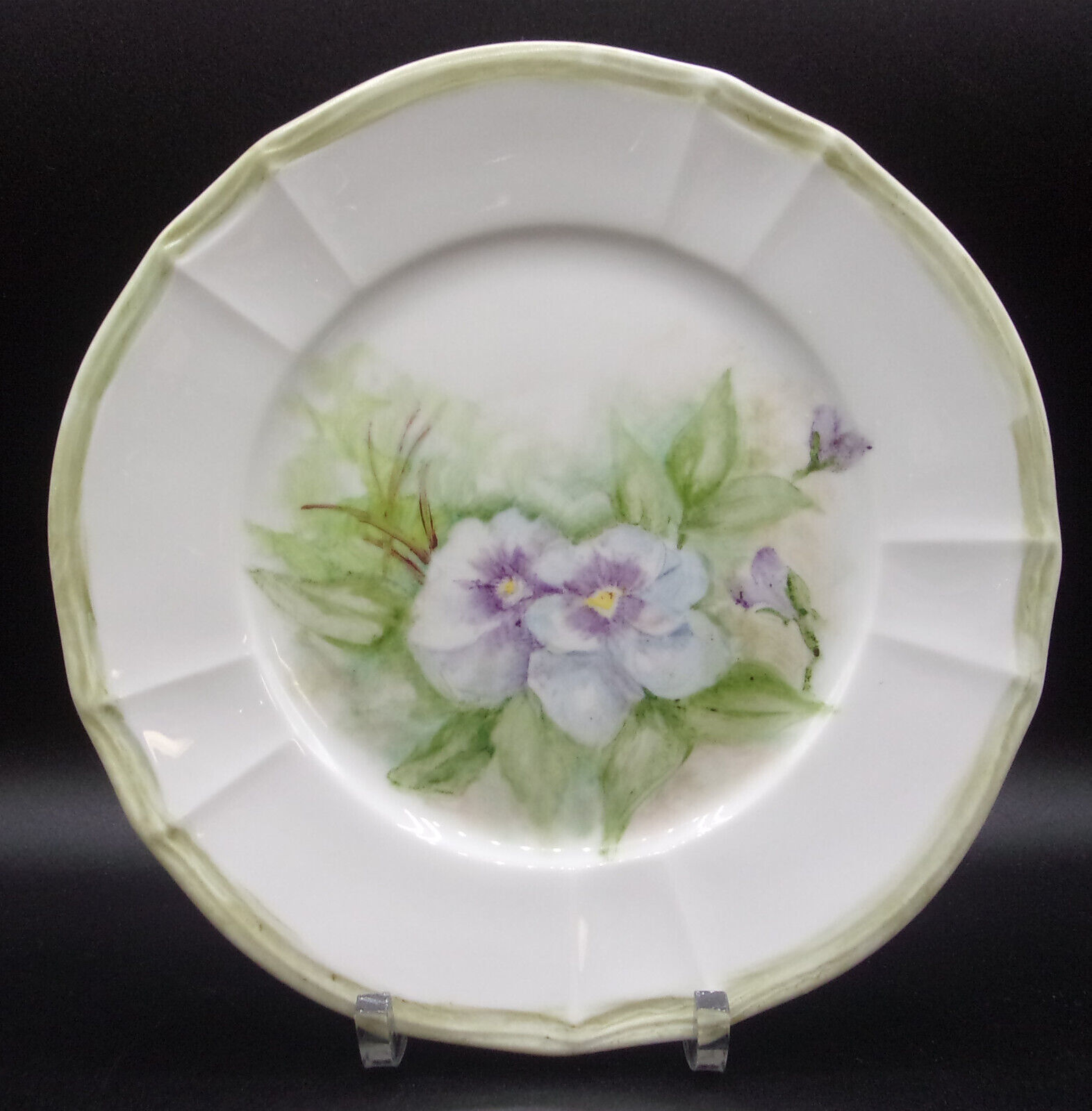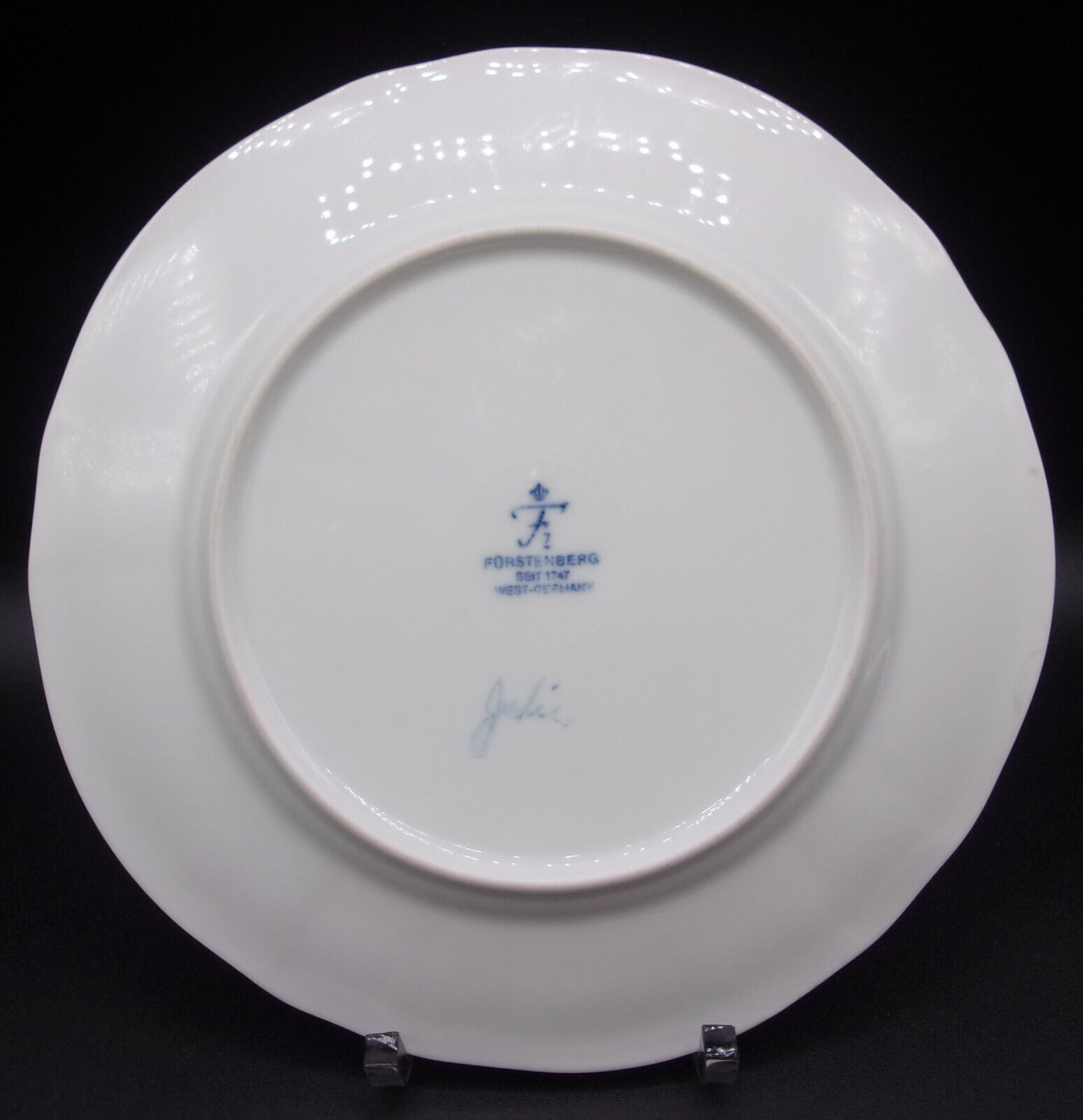 Fine, in excellent condition--no chips, no nicks, nice glossy-glazed white porcelain with hand-painted center of violet and purple pansies with yellow centers and with buds and stems on an array of green leaves to the lower flat plate base, lovely fluted bevels to the raised lip, and hand painted light green trim to the rim, raised unglazed round standing rim to the underside, with stamped deep blue crown and "Fz" Furstenberg Seit 1747 West Germany" under the glaze and "Julie" signed in blue paint on top of the glaze, all to the center of the underside.