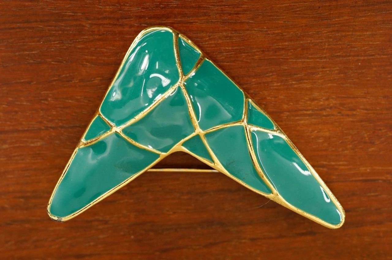 Vintage Costume Jewelry Teal Green & Gold Boomerang Figural Abstract Brooch Pin