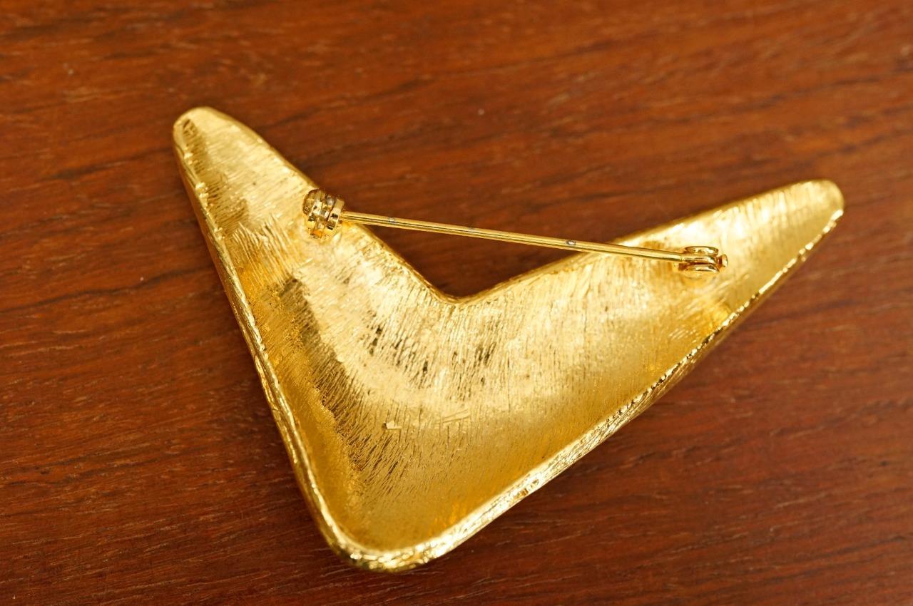 Vintage Costume Jewelry Teal Green Gold Boomerang Figural Abstract Brooch Pin. Measures 2-3/8" by 2" - bright gold tone base metal. Teal green enamel inlay.