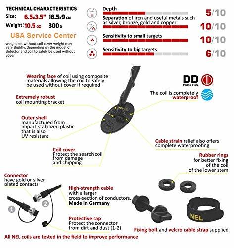 Bullet point: The Snake Coil is 6.5" long x 3.5" wide and designed to search areas heavily littered with iron and other trash debris. The elliptical shape of the coil helps to separate nonferrous metal from iron. The coil is light and weighs in at 10.5 Ounces, 300 Grams with coil cover.
