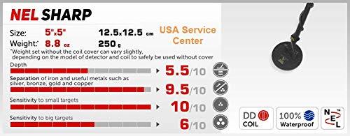 Bullet point: The NEL Sharp Coil is 5" round, DoubleD and designed to search areas heavily littered with iron and other trash debris. The shape of the coil helps to separate nonferrous metal from iron. The coil is light and weighs in at 8.8 Ounces, 250 Grams with coil cover.