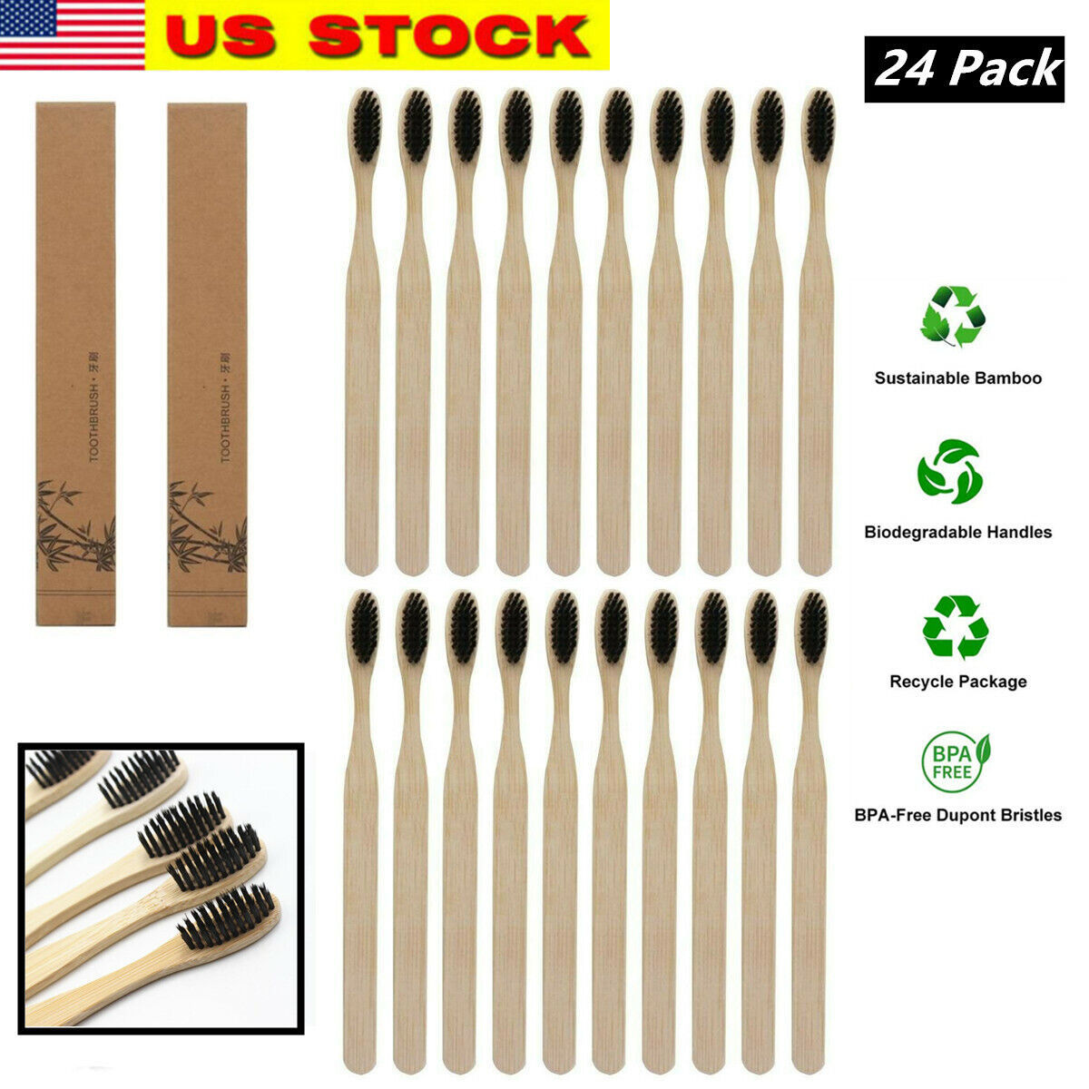 24 Pack Charcoal Bamboo Toothbrush Adult Organic Wooden Natural Eco Vegan