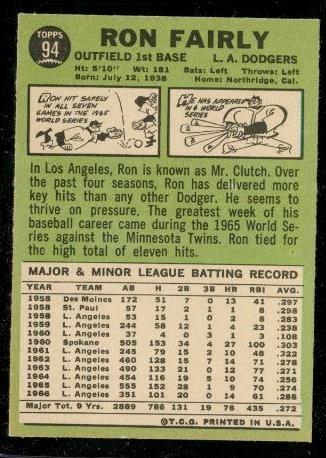 Vintage 1967 Topps Baseball Card #94 Ron Fairly Los Angeles Dodgers. Raw and ungraded. No smoke or pet odor.