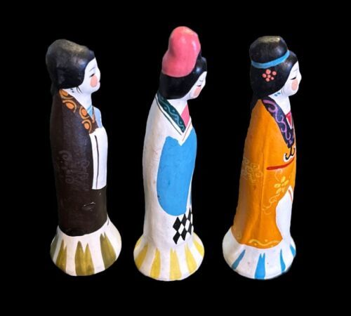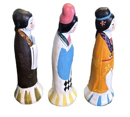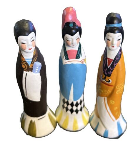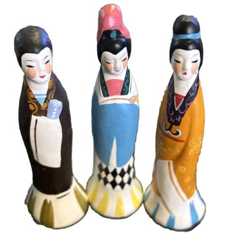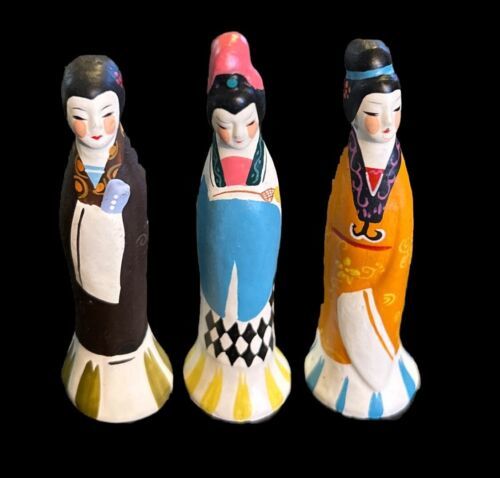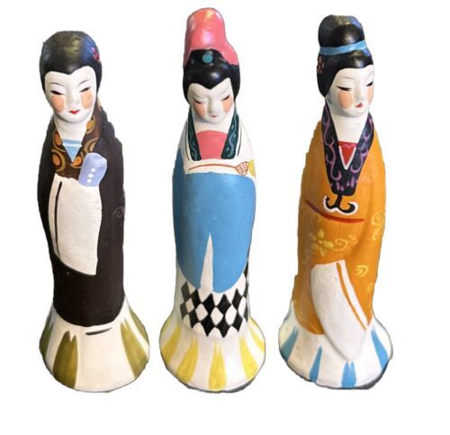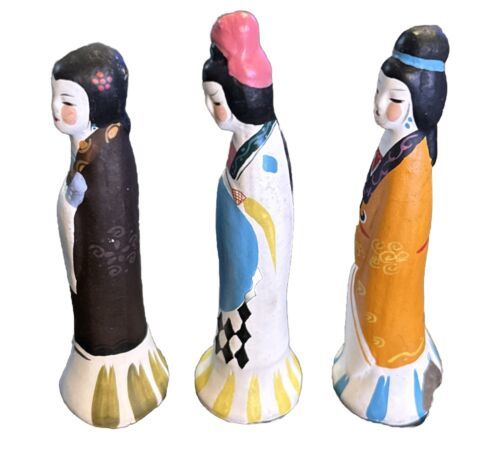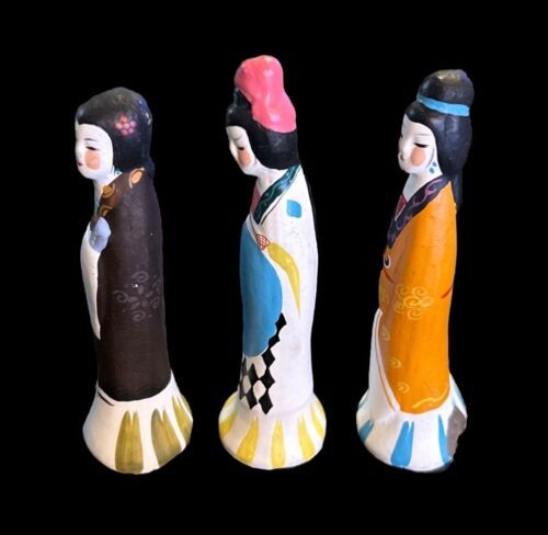 This is a set of three Chinese figurines depicting young girls in traditional garments. They are beautifully crafted and perfect for adding a touch of culture to any home. The figurines are made of high-quality materials and have been well-maintained.