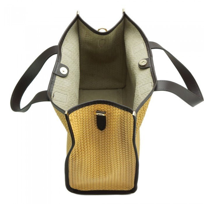 This tote is of precious leather goods, becoming a must-have accessory for a sophisticated daywear look. Crafted in Natural calf-skin and embossed in straw design with light gold-plated brass hardware. Large size with one compartment and a magnetic closure. Features two foldable handles and a detachable and adjustable leather strap. Versatile wearability as a crossbody or a shoulder bag.