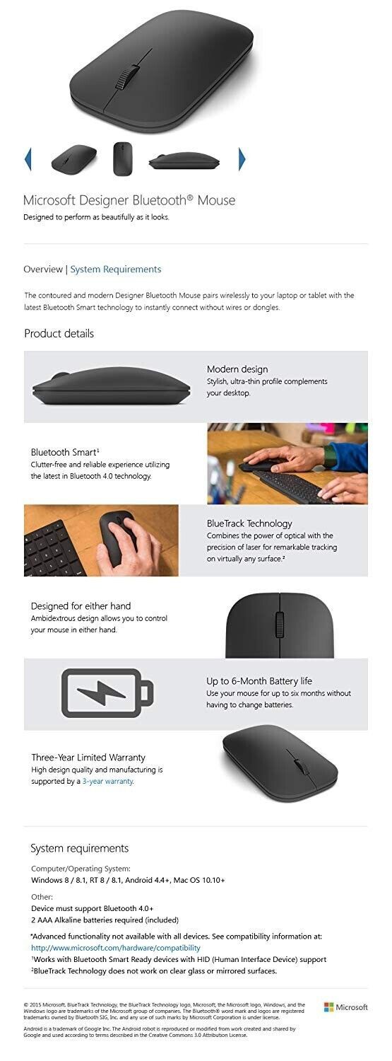 Product Features Modern design ? With a stylish look and ultra-thin profile, this mouse perfectly complements your desktop for that sleek and sophisticated look Bluetooth Smart ? Enjoy wireless freedom and a clutter-free desk with a mouse that utilizes the latest in Bluetooth 4.0 technology to connect to your computer for a reliable experience BlueTrack Technology ? Move your mouse with confidence using BlueTrack technology, which combines the power of optical with the precision of laser for remarkable tracking on virtually any surface. Designed for either hand ? An ambidextrous design allows you to control your mouse in either hand, making it the perfect fit for just about any user. Up to 6-Month Battery life ? With up to a six month battery life, you can confidently use your mouse without having to worry about changing the batteries. Plus, a battery status indicator tells you when battery power is low.