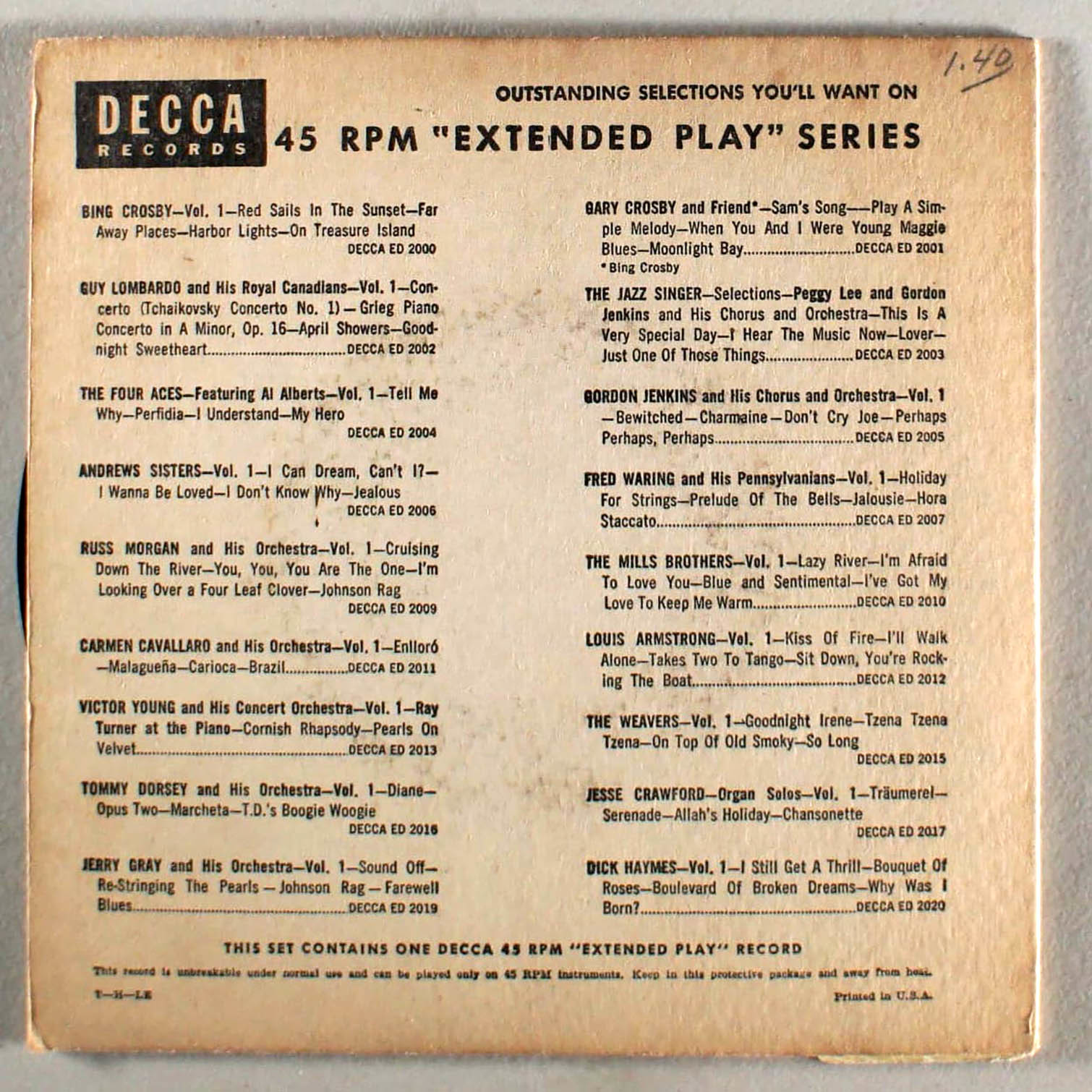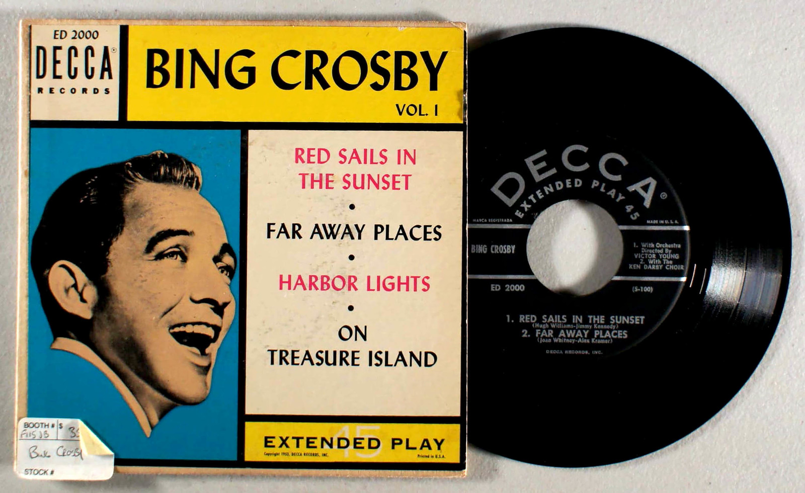 Vol. I (7" EP), by Bing Crosby, features the hit singles Red Sails in the Sunset (No. 1 in 1935), Far Away Places (No. 2 in 1949), Harbor Lights (No. 8 in 1959), and On Treasure Island (No. 8 in 1935).