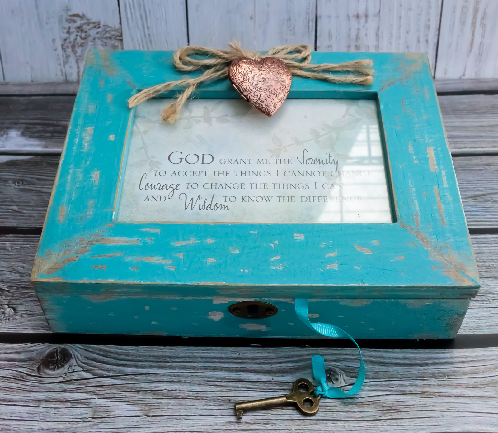God Grant Me Serenity Courage Wisdom Locket Heart Teal Wood Musical Trinket Box