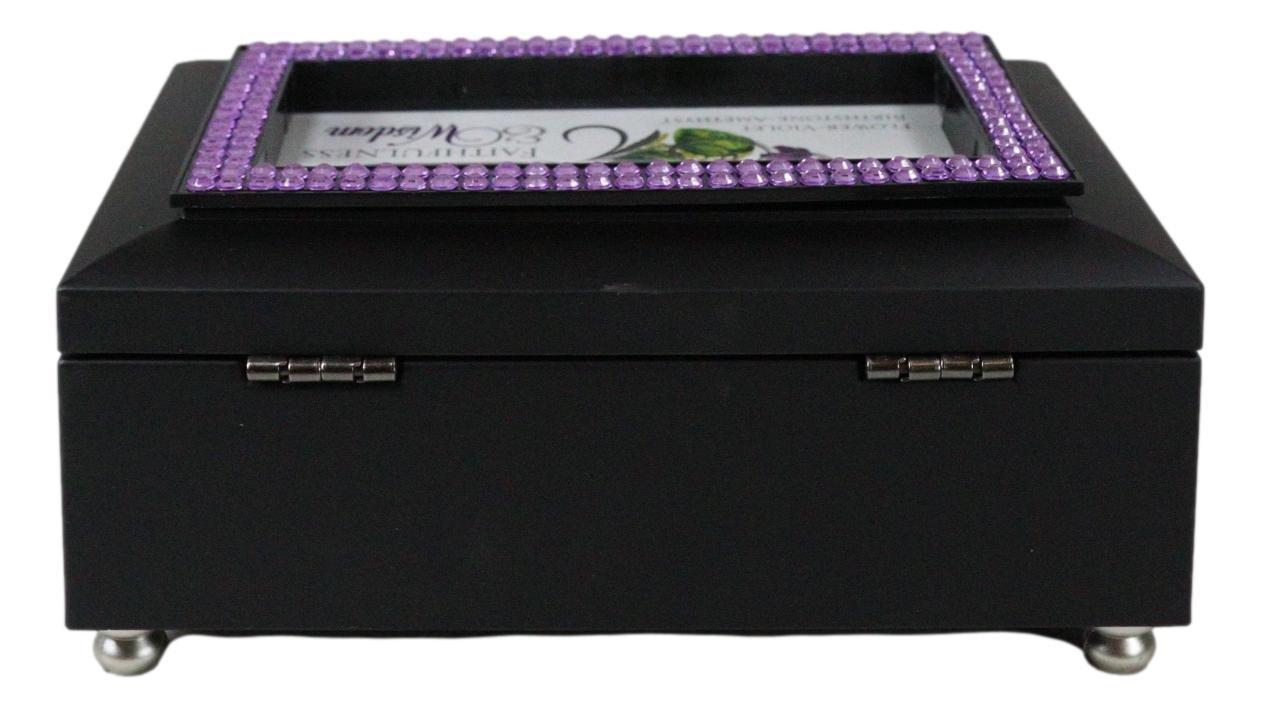 ? Beautiful birthstone jeweled photo frame lid and sweet word sentiment art gives this wooden music box a timeless appeal. Personalize this black box by replacing the sentiment artwork with 4 x 2 inch photo. Box is lined with protective rich velvet and padded feet. Quality hinges keep the lid upright when opened. Comes in nice packaging for easy wrapping. Attractive pretty jewels and gems from a border around the sentiment card.