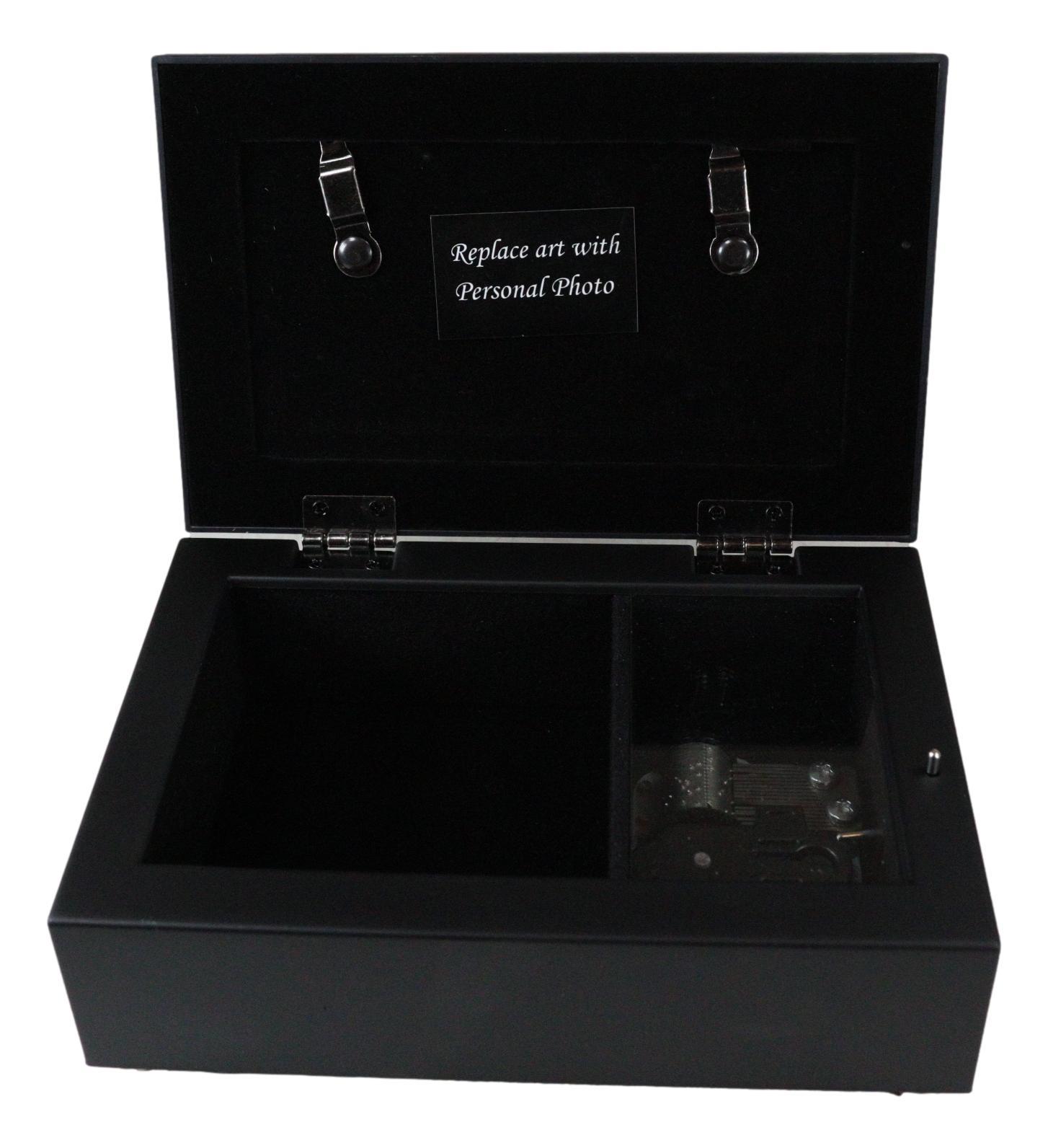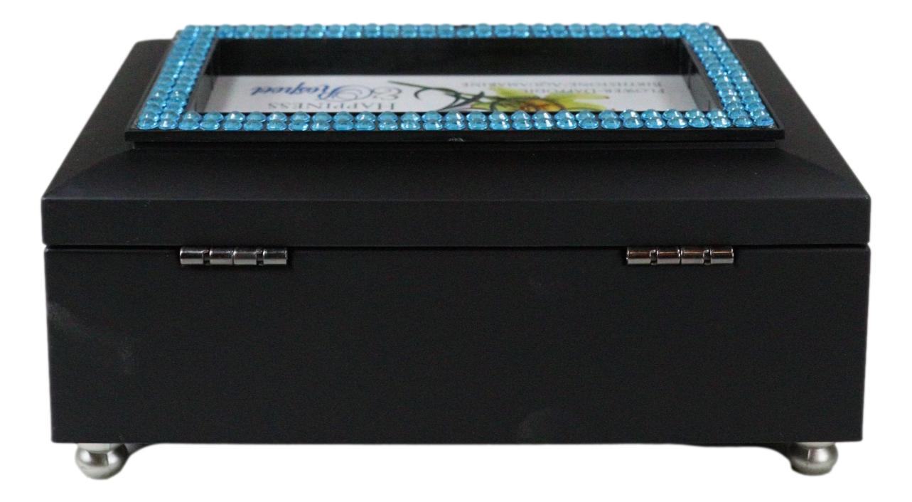 ? Beautiful birthstone jeweled photo frame lid and sweet word sentiment art gives this wooden music box a timeless appeal. Personalize this black box by replacing the sentiment artwork with 4 x 2 inch photo. Box is lined with protective rich velvet and padded feet. Quality hinges keep the lid upright when opened. Comes in nice packaging for easy wrapping. Attractive pretty jewels and gems from a border around the sentiment card.