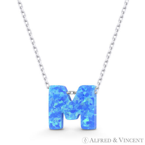 Initial Letter M Blue Lab-Created Opal 10mm Pendant 925 Sterling Silver Necklace