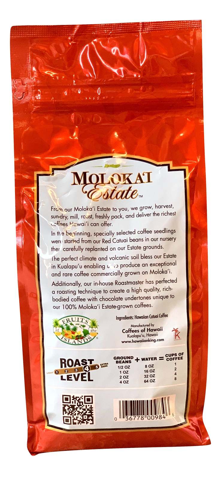 From the Moloka'i Estate to you, this coffee is grown, harvested, sun-dry, milled, roasted, freshly packed, and delivers the richest coffee Hawai'i can offer. In the beginning, specially selected coffee seedlings were started from their Red Catuai beans in the nursery then carefully replanted on Estate grounds. The perfect climate and volcanic soil bless the Estate in Kualapu'u enabling them to produce an exceptional and rare coffee commercially grown on Moloka'i. Additionally, their in-house Roastmaster had perfected a roasting technique to create a high quality, rich-bodied coffee with chocolate undertones unique to 100% Moloka'i Estate-grown coffees.