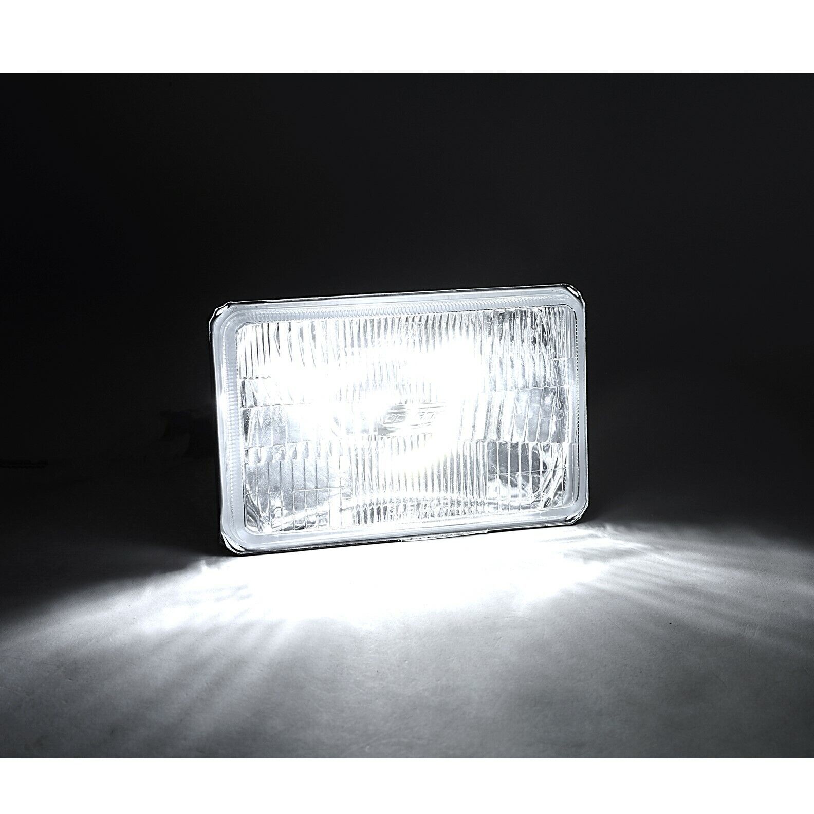 THIS LISTING IS FOR A NEW SET OF 4 - 4x6" STOCK STYLE GLASS LENS / METAL BACKSIDE H4 CONVERSION HEADLIGHTS WITH WHITE LED LIGHT BULBS. THIS SET INCLUDES 2 HIGH BEAM 2 HIGH / LOW BEAM HEADLIGHTS. THESE HAVE THE ORIGINAL SHAPED PRONGS ON THE BACK SO THEY WILL PLUG RIGHT INTO YOUR ORIGINAL WIRING HARNESS PLUGS. THESE ARE BRIGHTER AND WHITER THAN THE STOCK STYLE INCANDESCENT SEALED BEAM HEADLIGHTS. IN RARE CIRCUMSTANCES, WIRING MODIFICATION MAY BE REQUIRED. THESE ARE FOR ANY CAR OR TRUCK THAT HAS 4 SQUARE 4x6" HEADLIGHTS.