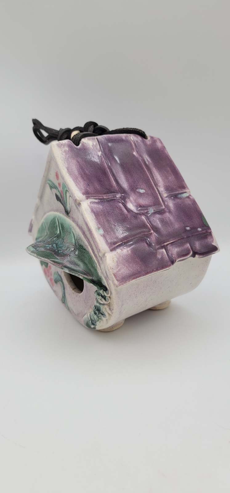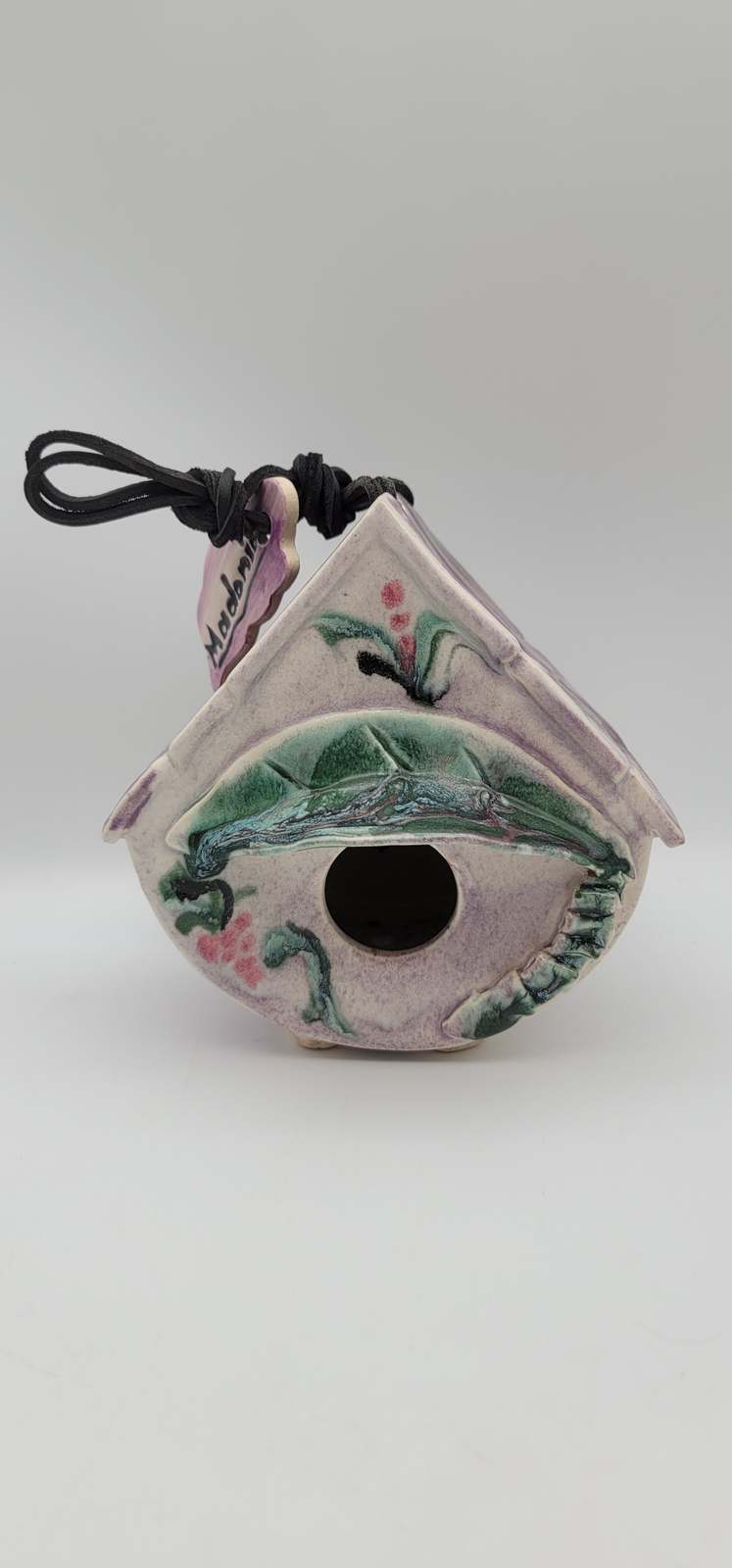 Crafted from clay, this birdhouse exudes a vintage aesthetic with its weathered appearance and rustic charm. The intricate details and hand-painted designs showcase the artist's attention to detail and love for her craft. Each birdhouse is a true work of art, featuring unique patterns, colors, and textures that make it truly special.