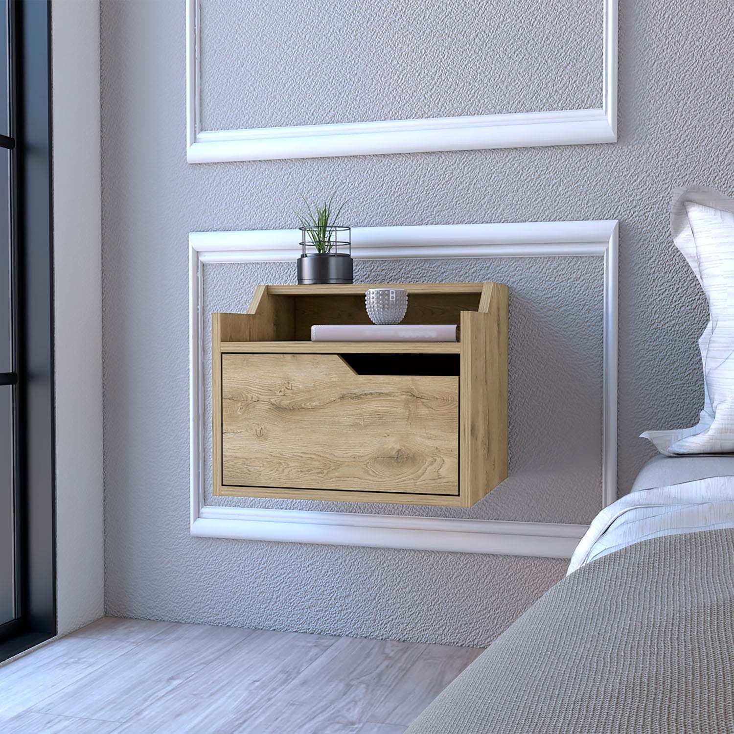 Introducing the "Floating Nightstand Chester" a sleek design and functionality fusion. This nightstand flaunts a spacious built-in drawer measuring 12.3" W x 4.7" H x 10.1" D, seamlessly blending with any modern decor. The dual-tier top shelf, featuring dimensions of 14.5" W x 12.1" D, offers display and easy-access storage options. Designed with macadamia, white, dark brown, black or light gray finishes, its manufactured wood construction ensures lasting elegance. With its easy wall-mount design, Chester is not just a nightstand but a statement piece. Ideal for contemporary bedrooms seeking a blend of style and convenience.