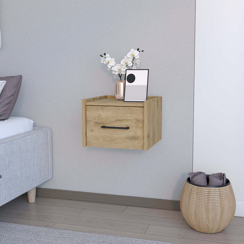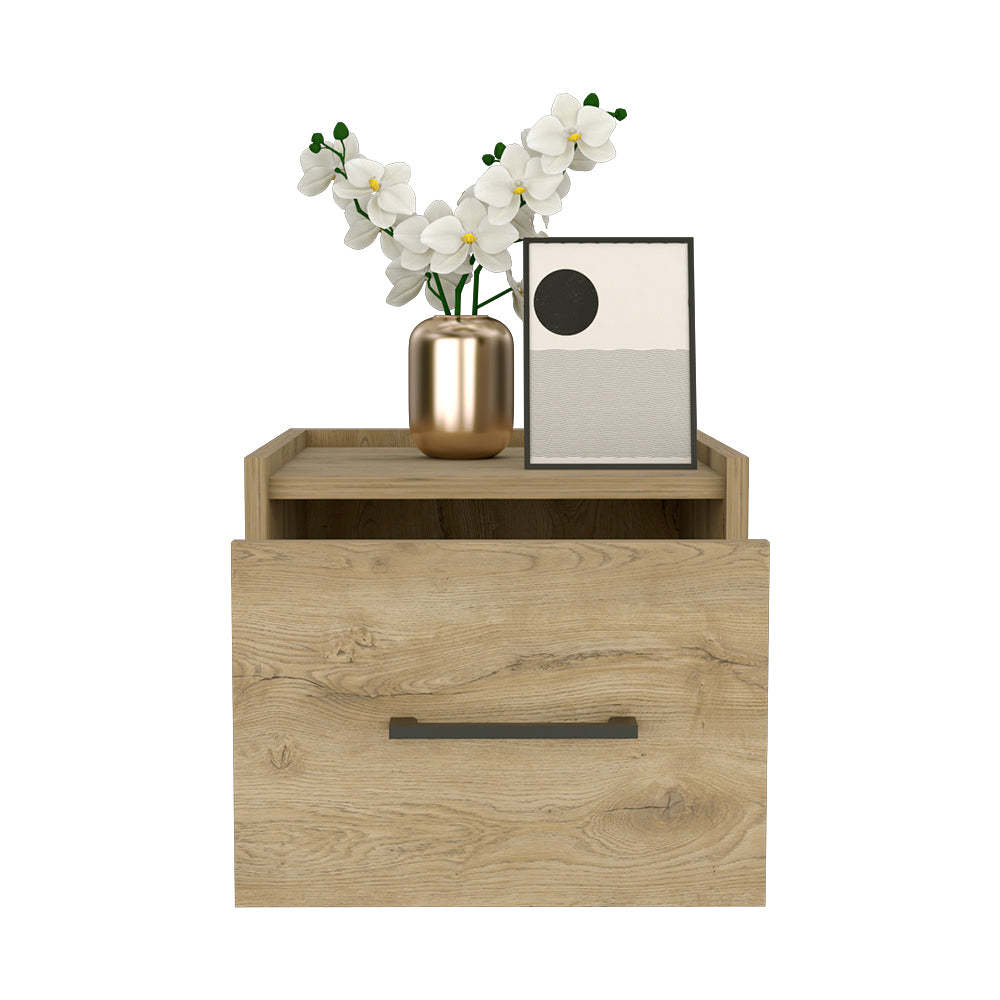 The Calion Floating Nightstand embodies contemporary design with practicality. Assembly effortlessly to your wall, this sleek piece not only adds to your room's aesthetic but also maximizes its floor space. A smooth-gliding drawer (10.4"W X 4.7"H) offers a neat stash-away option for your essentials. Its ample top (12.6"W X 12.8"H) can house anything from a reading lamp to your current book, ensuring they're always within reach. Available in White, Macadamia, Dark Brown, Black or Light Gray finishes, each made of durable manufactured wood, the Calion seamlessly complements any bedroom motif. Elevate your bedtime routine with style and convenience.