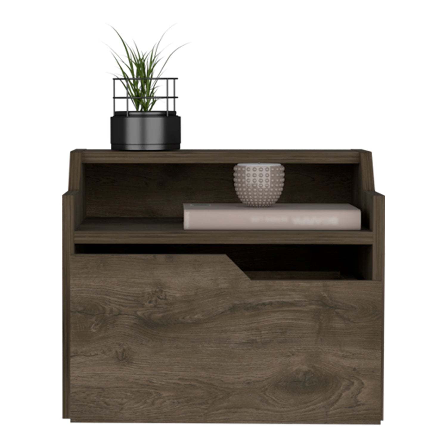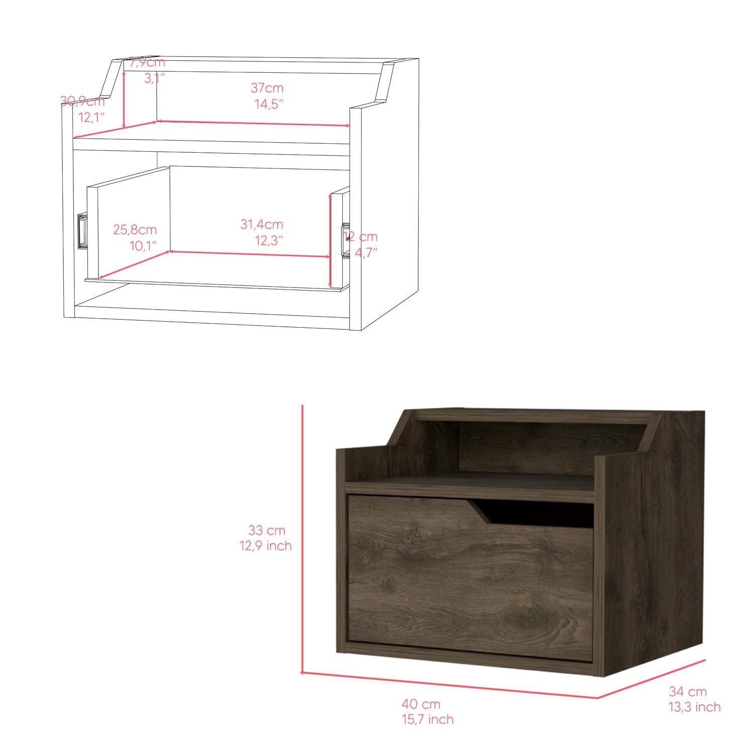 Introducing the "Floating Nightstand Chester" a sleek design and functionality fusion. This nightstand flaunts a spacious built-in drawer measuring 12.3" W x 4.7" H x 10.1" D, seamlessly blending with any modern decor. The dual-tier top shelf, featuring dimensions of 14.5" W x 12.1" D, offers display and easy-access storage options. Designed with macadamia, white, dark brown, black or light gray finishes, its manufactured wood construction ensures lasting elegance. With its easy wall-mount design, Chester is not just a nightstand but a statement piece. Ideal for contemporary bedrooms seeking a blend of style and convenience.