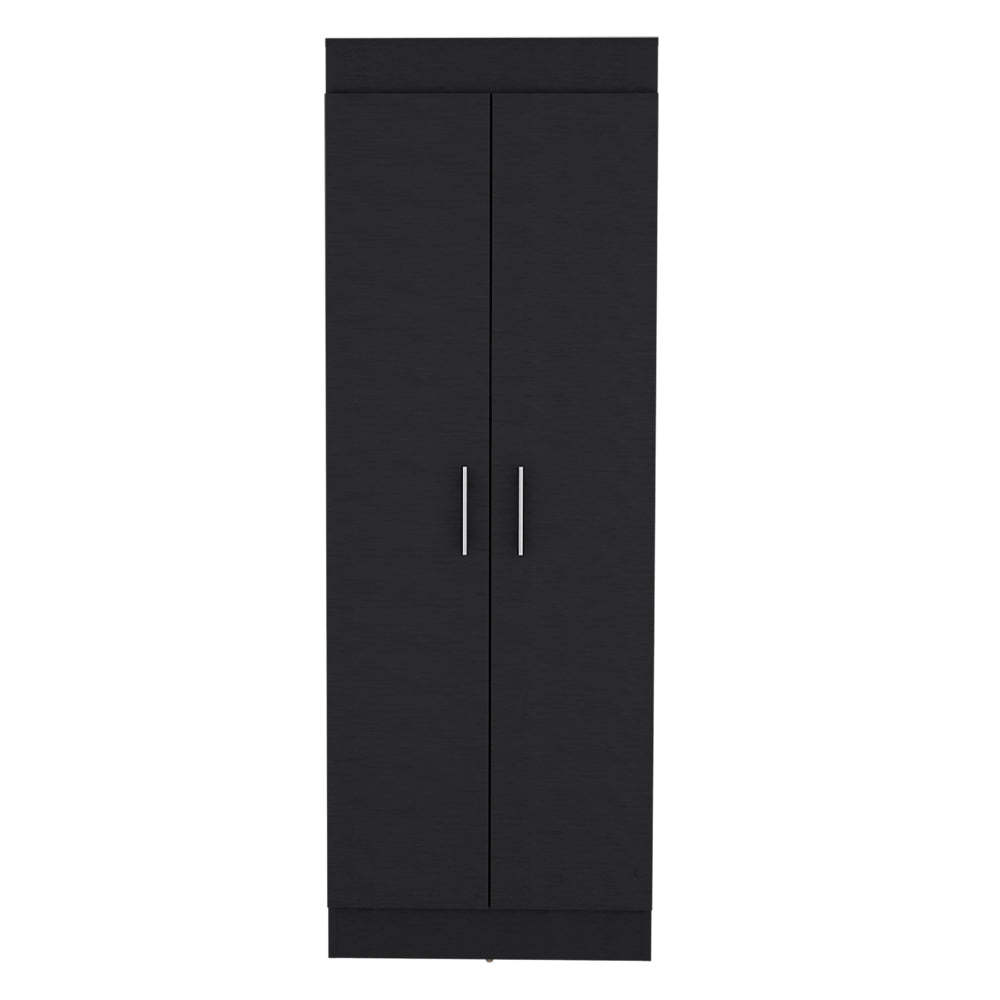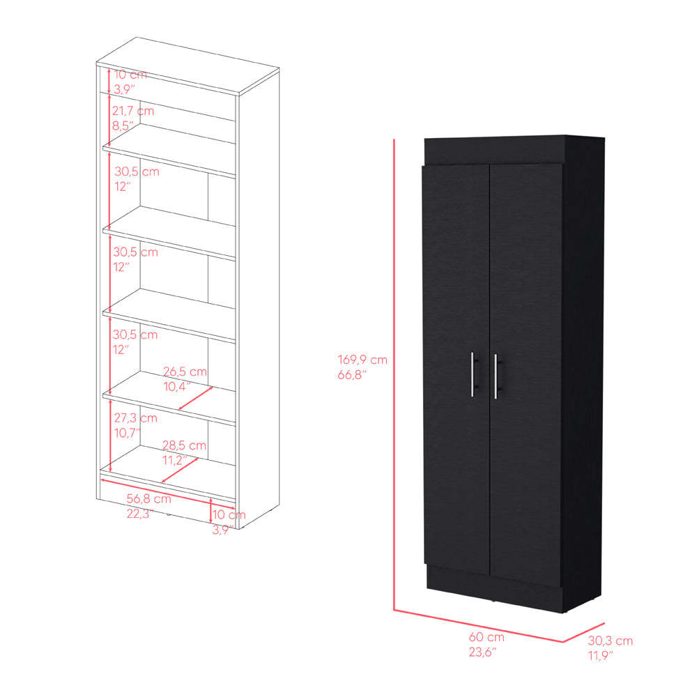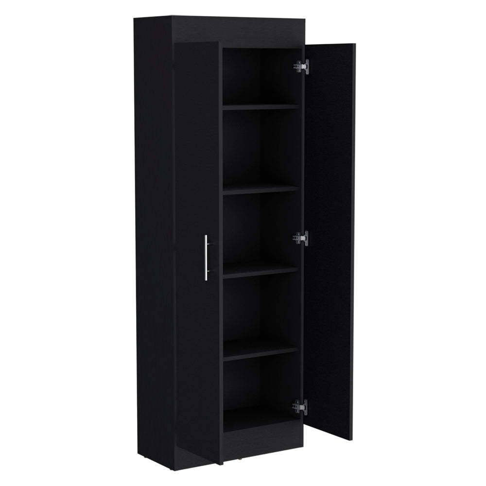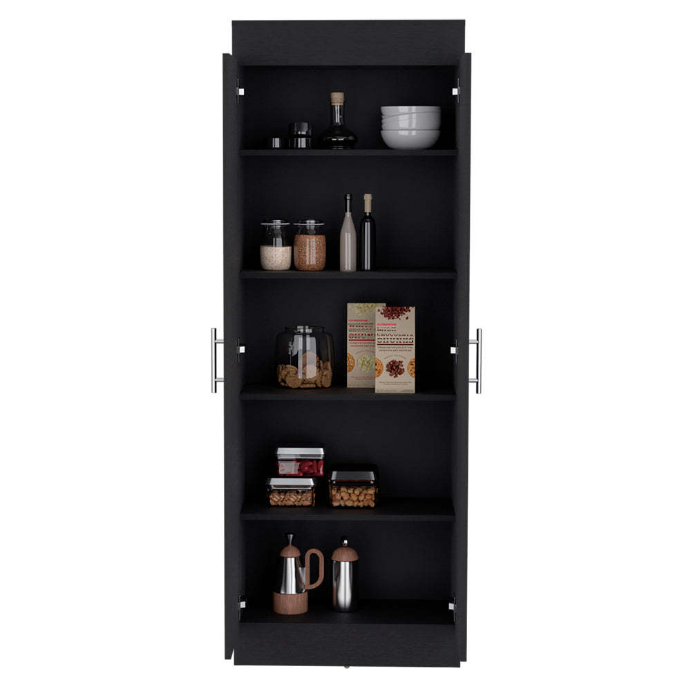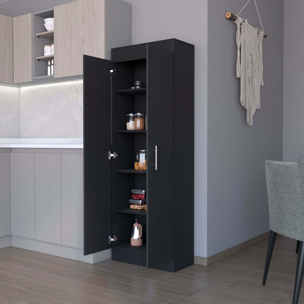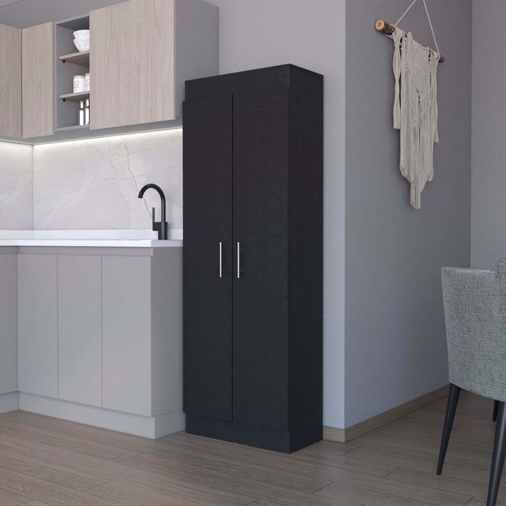 Upgrade your kitchen with the sleek "Clinton Pantry Cabinet." This compact, black-finished cabinet is a stylish and practical storage solution. Crafted from durable manufactured wood, it features two doors with metal handles opening to multiple 12"H x 10.4"D shelves, ideal for organizing all your kitchen essentials. The Clinton Cabinet combines elegance with functionality, perfect for both small and spacious kitchens.