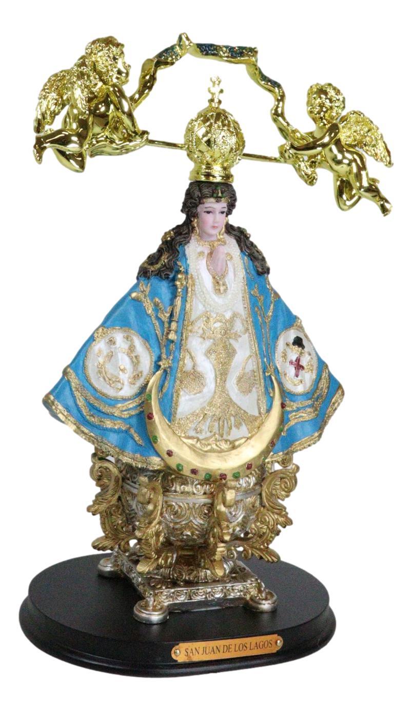 ? Our Lady of San Juan De Los Lagos is adorned with a resplendent golden crown and surrounded by celestial angels carrying a banner. Crafted with utmost reverence, this figurine encapsulates the divine beauty and grace of the revered Virgin Mary. The intricate detailing captures the serenity in her expression, while the radiant golden crown symbolizes her regal presence. Encircled by angelic companions, each delicate wing and ethereal detail adds to the celestial aura of this sacred piece.