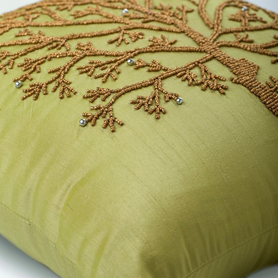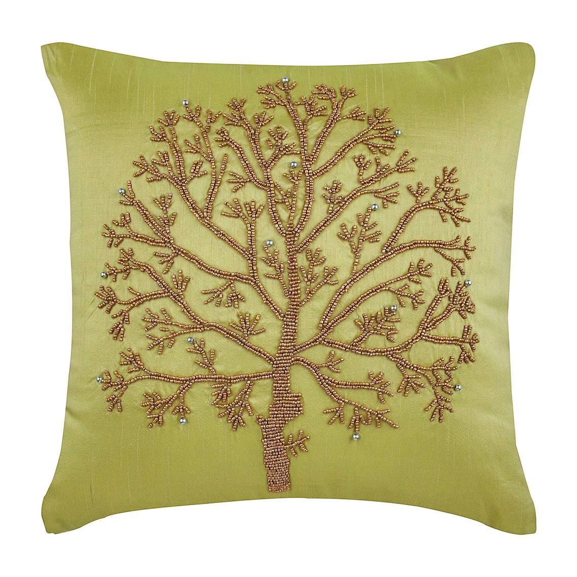 Metallic Beaded Tree 16"x16" Art Silk Apple Green Pillows Cover, Tree Of Life