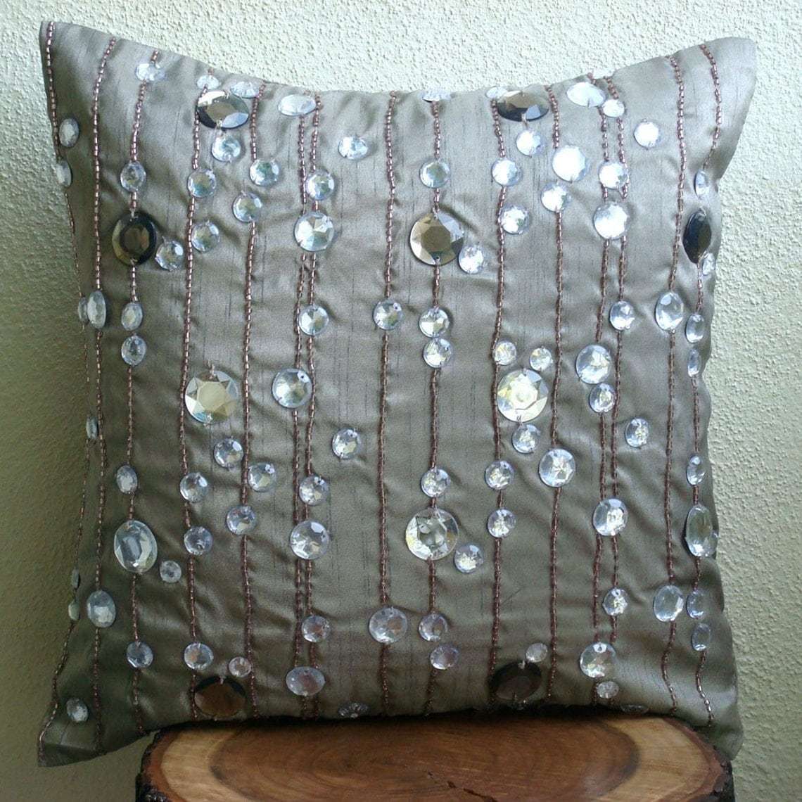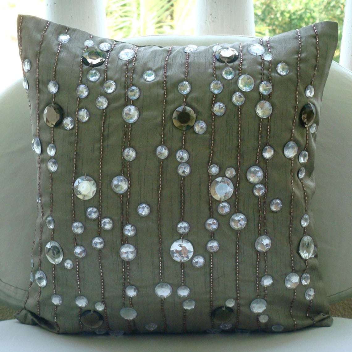 Gray Lined Crystals 16"x16" Silk Pillows Covers for Couch, Diamond Strings