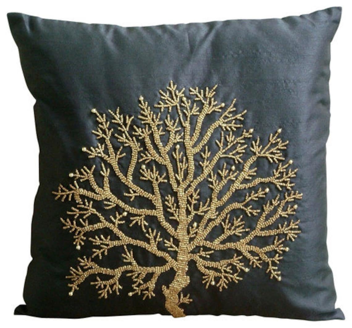 Black Art Silk 16"x16" Beaded Tree Pillow and 50 similar items
