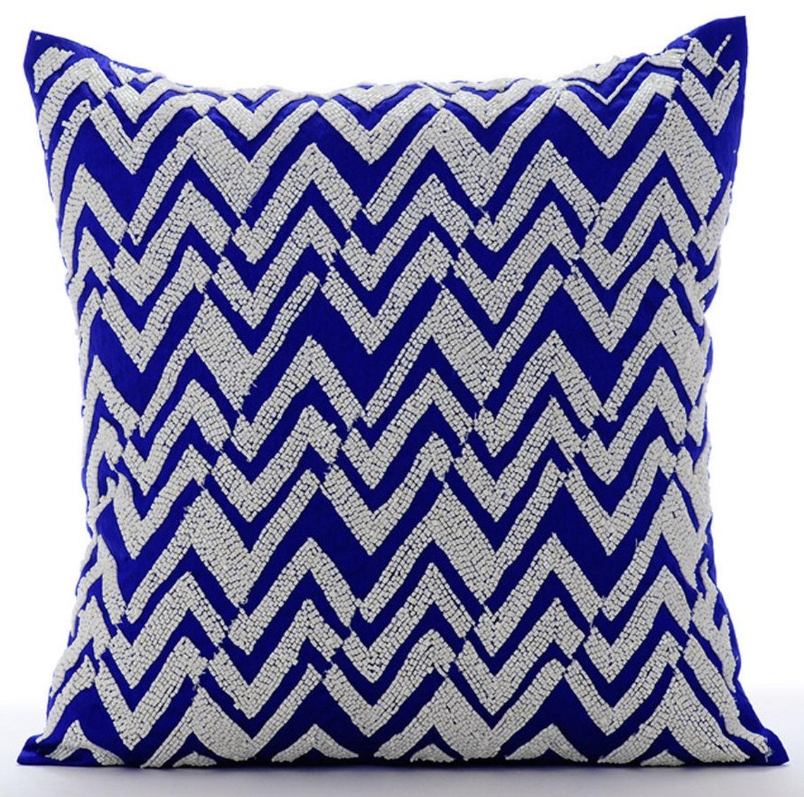 Beaded Chevron 16"x16" Art Silk Royal Blue Pillows Cover, White Chevron