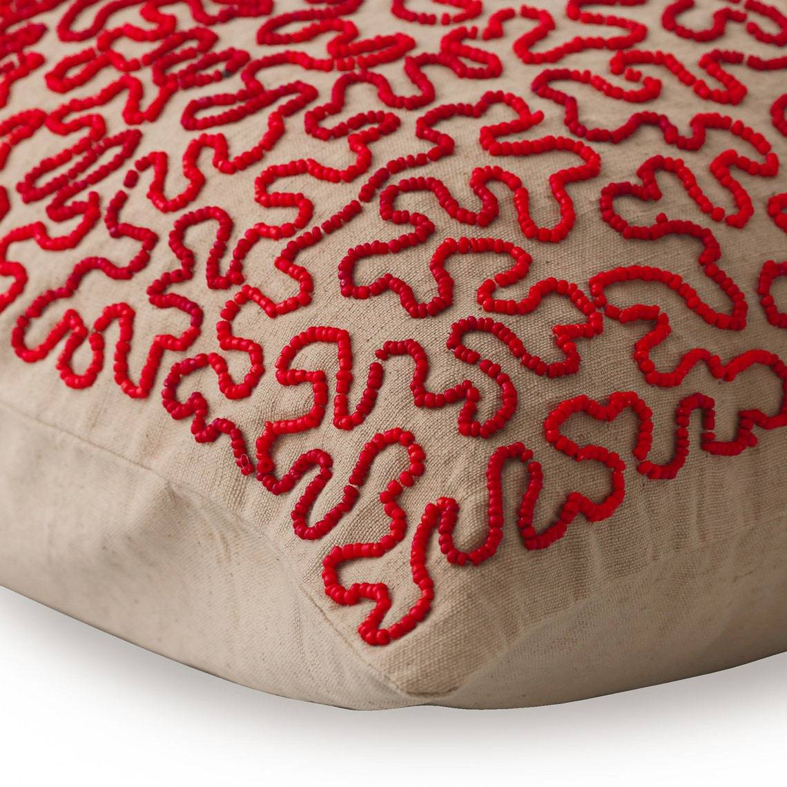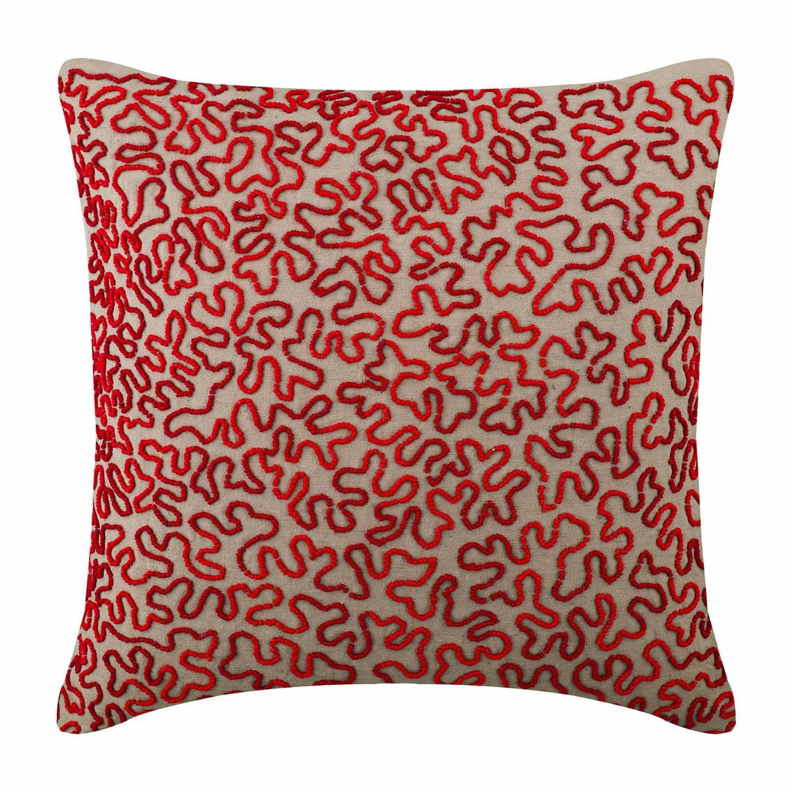 Beige Cotton Linen 16"x16" Read & Maroon Scroll Pillows Cover, Blooming Maze