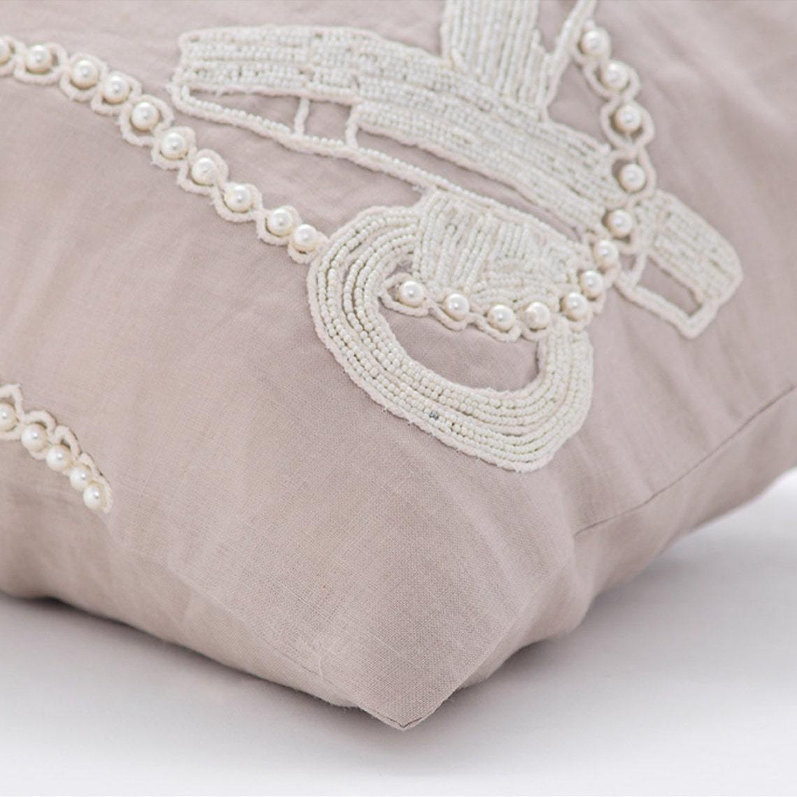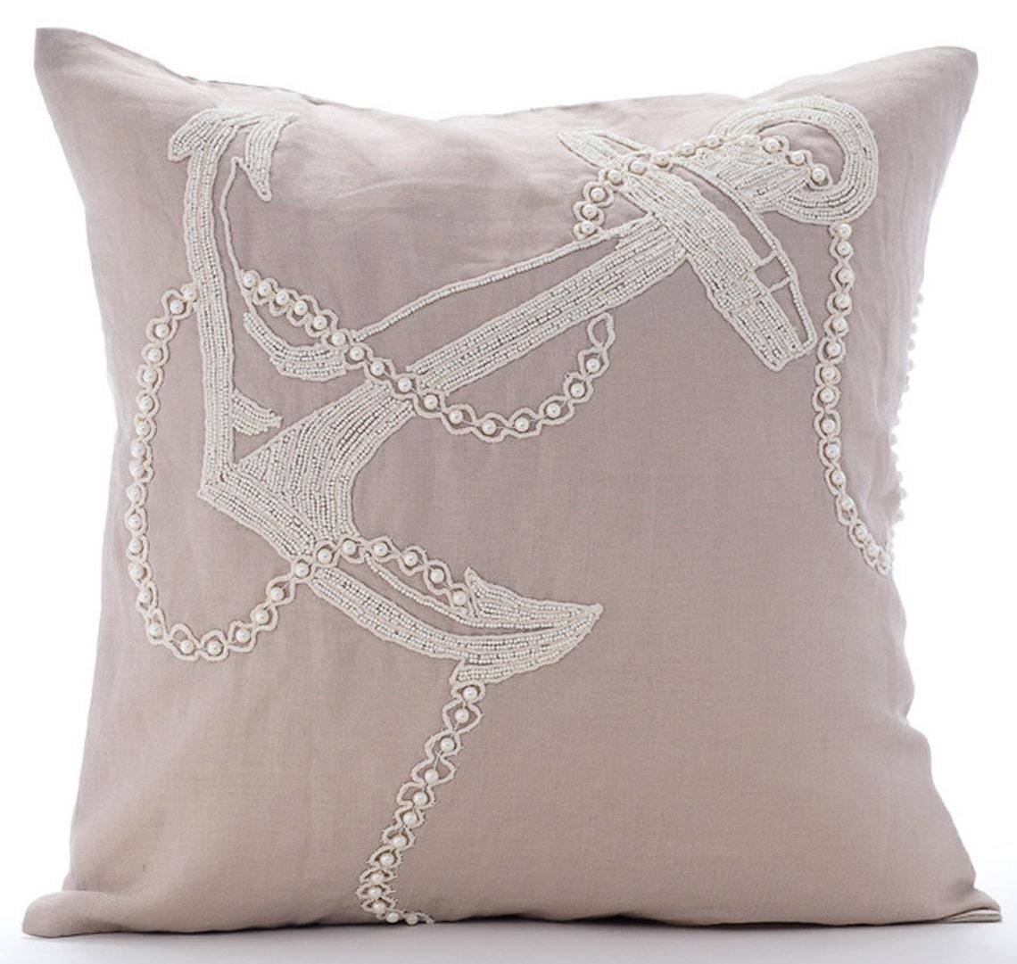 Beaded Anchor Design Beige Cotton Linen 16"x16" Pillow Case, Pearl Anchor