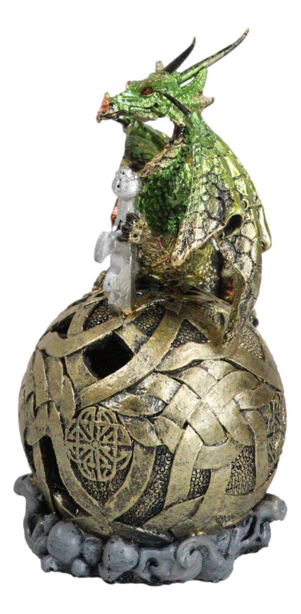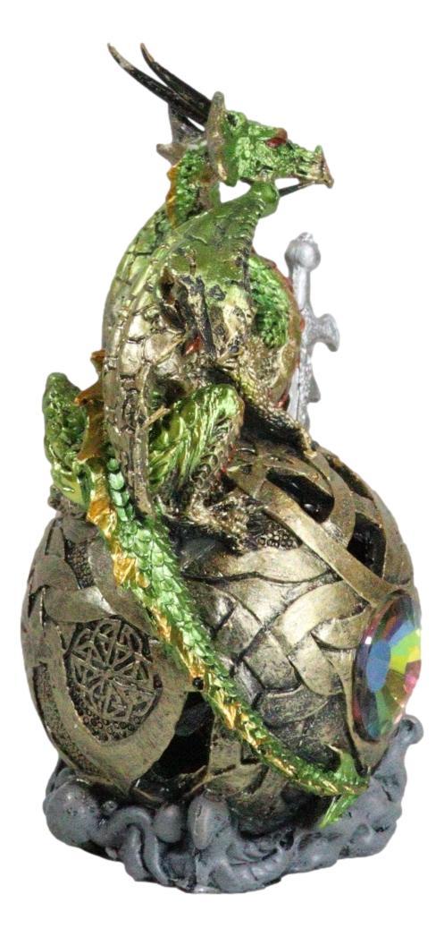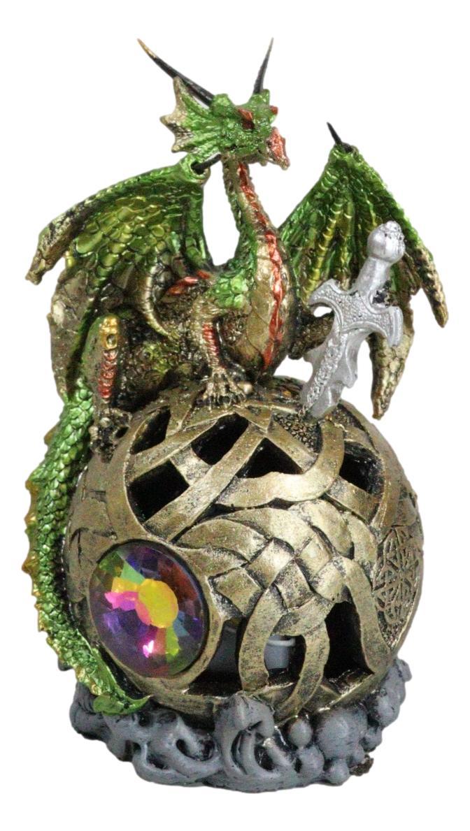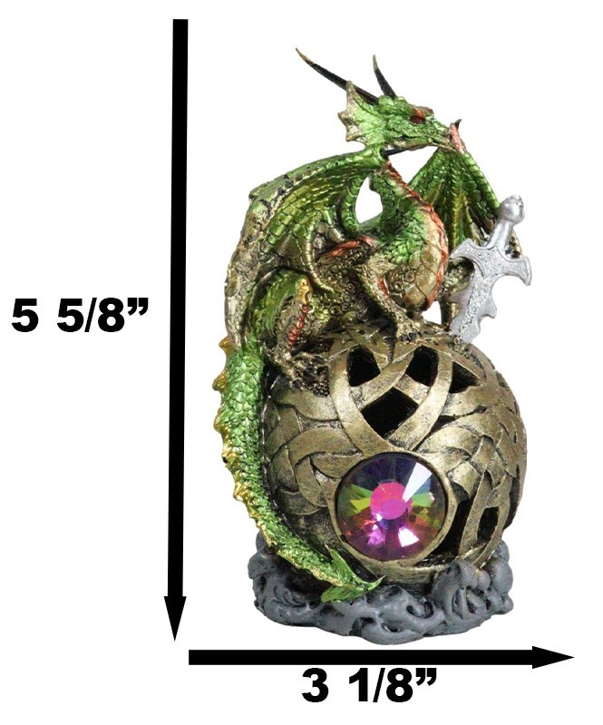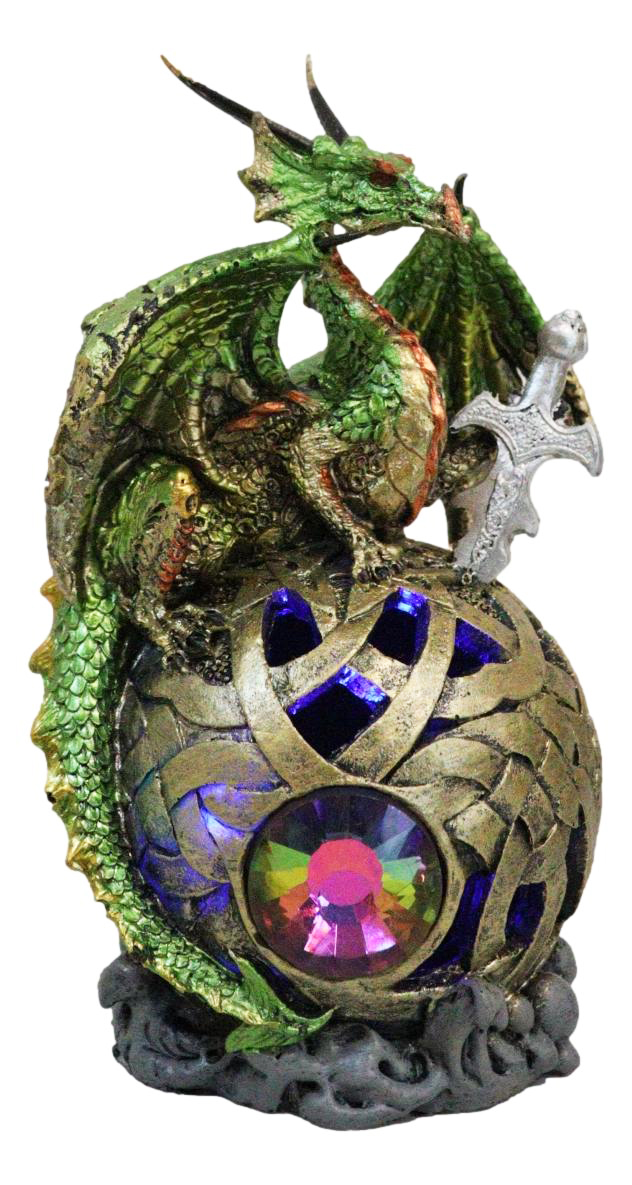 ? This lovely figurine will delight any dragon lover! It features an iridescent beast perched atop an orb designed with Celtic Knotwork. The dragon has shining green and gold scales and a lighter gold underbelly. The dragon holds a silver sword. The sphere it sits upon has unique interlocking pieces reminiscent of Celtic knotwork, and a gem glistens from the center. A unique way to bring some sparkle and magic into your home!