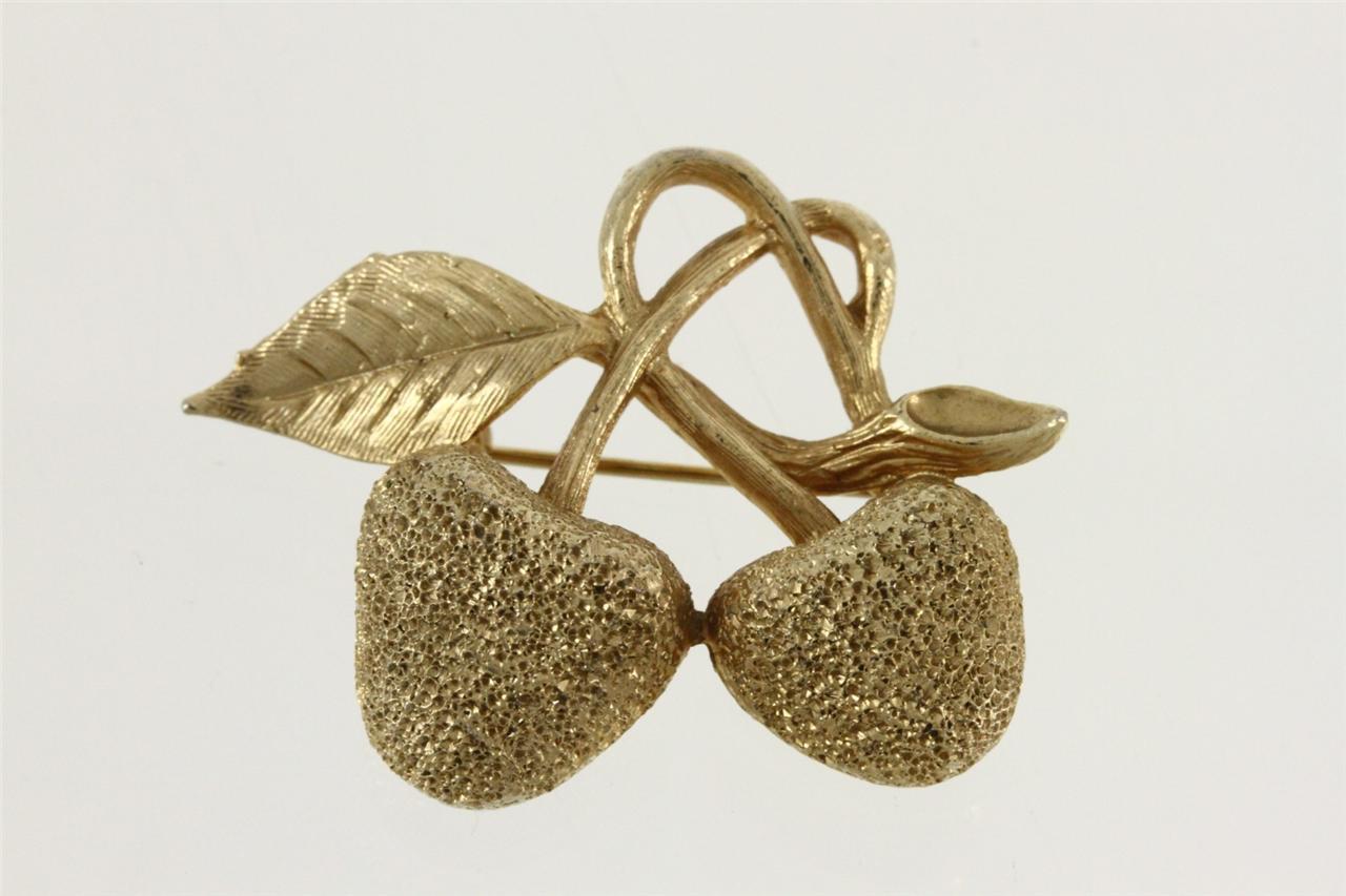 Vintage Costume Jewelry Brushed Gold Tone Twin Cherry Brooch Pin. Measures 1.25" tall. Smoke and pet free. Nicely detailed. No smoke or pet odors.