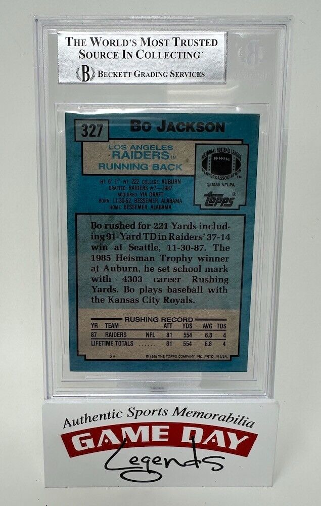 This Bo Jackson autographed trading card from the 1988 Topps set is a must-have for any NFL fan. The card features a picture of Bo Jackson in his Los Angeles Raiders uniform and is hard-signed by the player himself. The card is authenticated by Beckett Authentication Services (BAS), ensuring its authenticity.