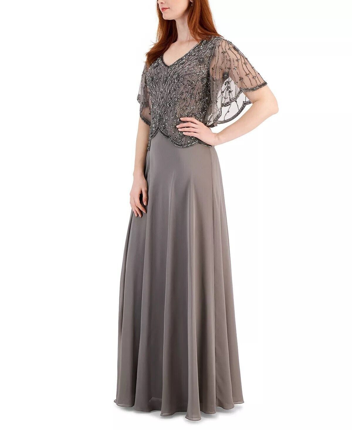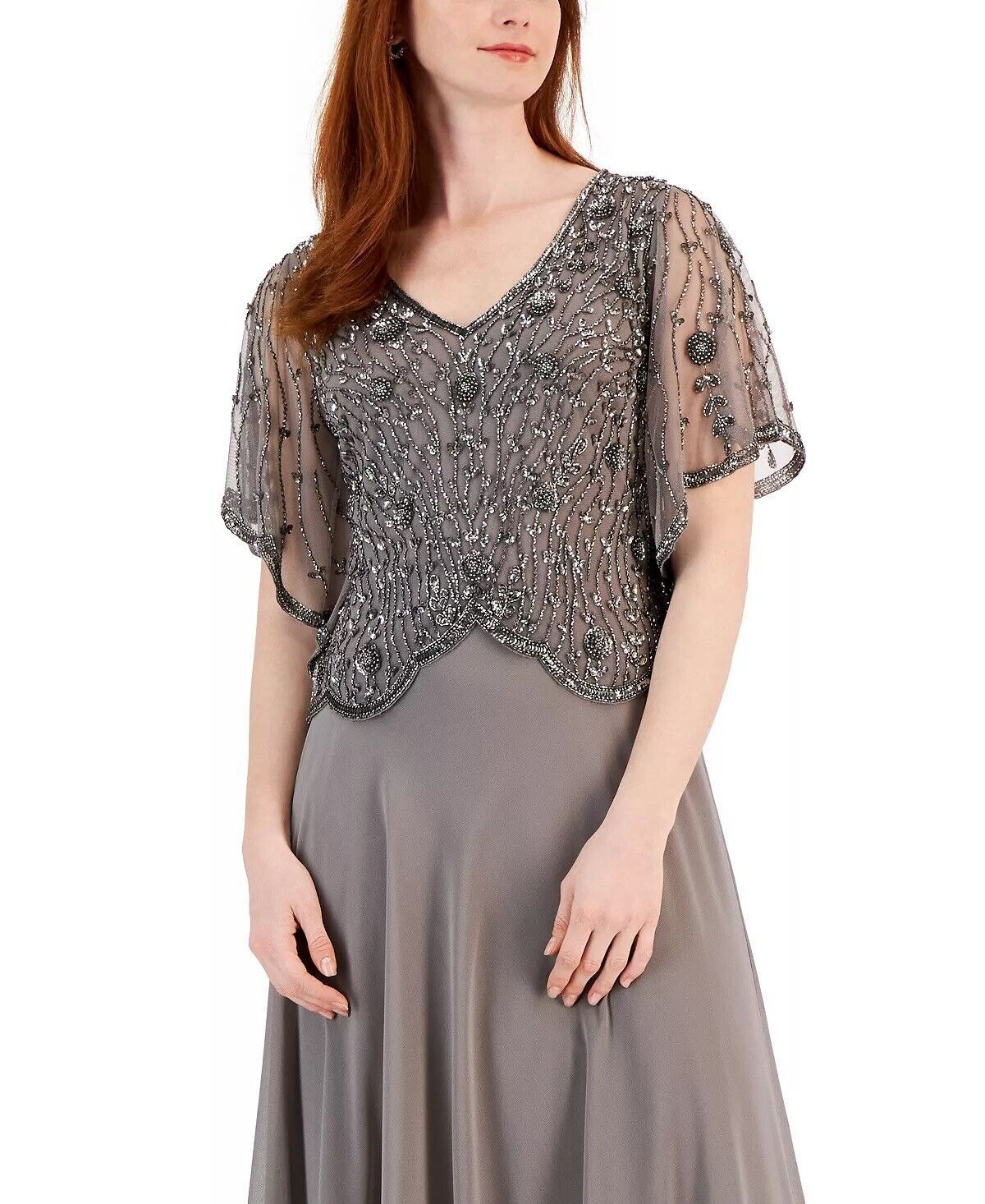 Winding lines and lustrous clusters of beads add a scalloped-edge layer of luxe to this J Kara V-neck gown, an elegant selection for a wedding guest or mother of the bride or groom.