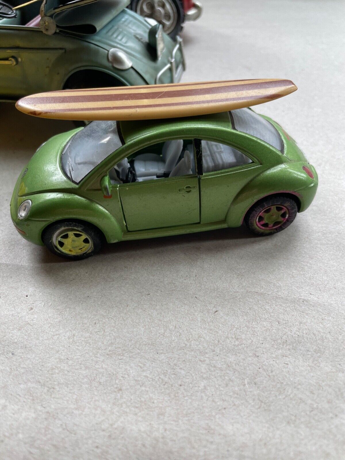 VINTAGE LOT OF (5) CARS. VW Beetle, Bus, New Beetle, All with SURFBOARD's