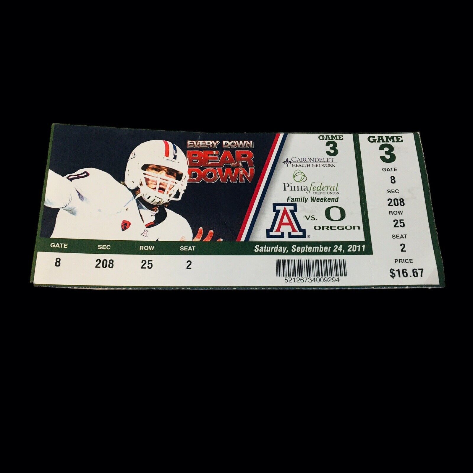 This is a rare ticket stub from Game 3 Arizona vs. Oregon College Football game. Small crease in middle area. On this day September 24th 2011, The QB for Arizona, before he WON the Super Bowl for The Philadelphia Eagles, Nick Foles completed 33 of 55 passes for 391 yards and three touchdowns for the Wildcats.
