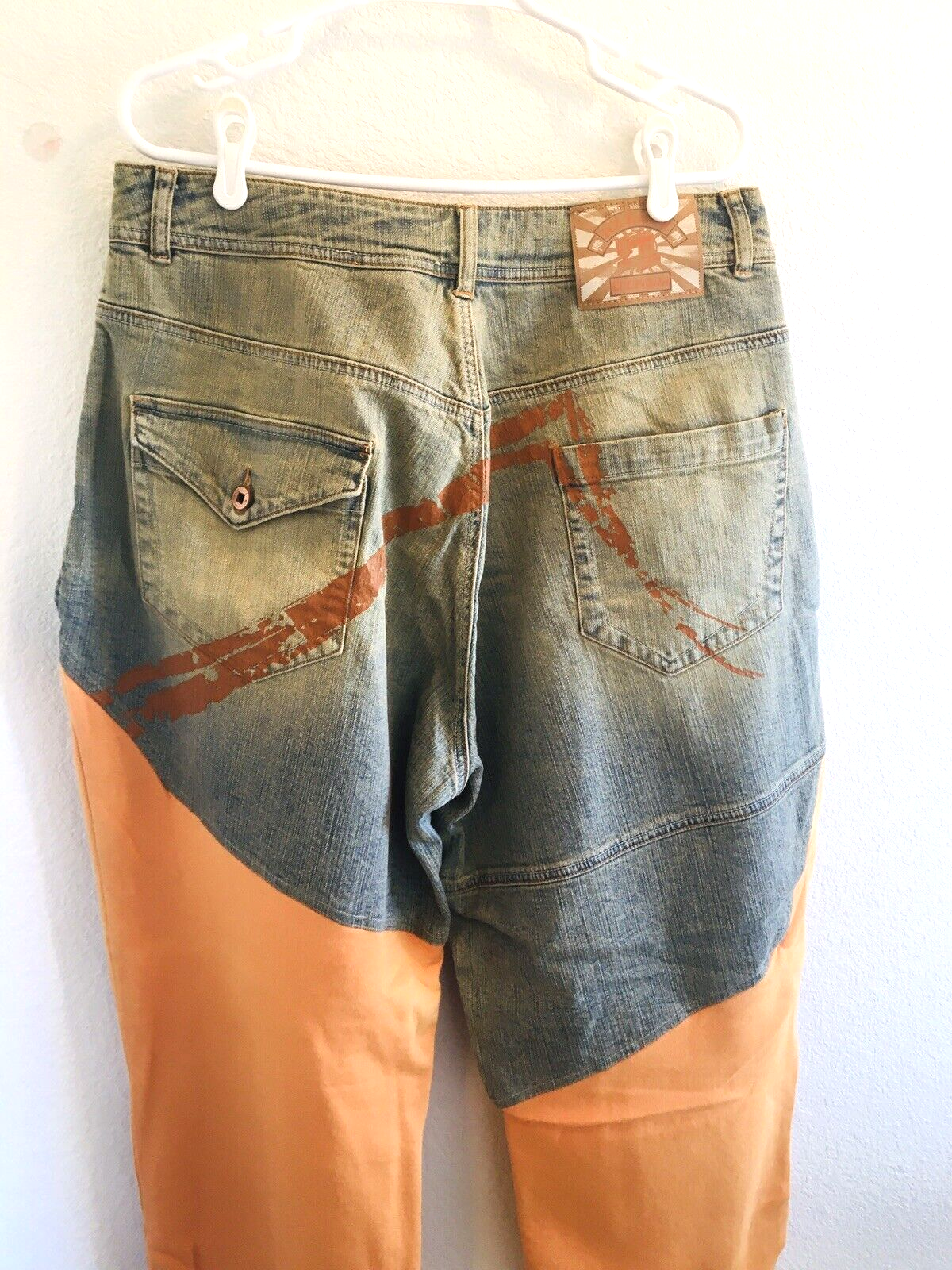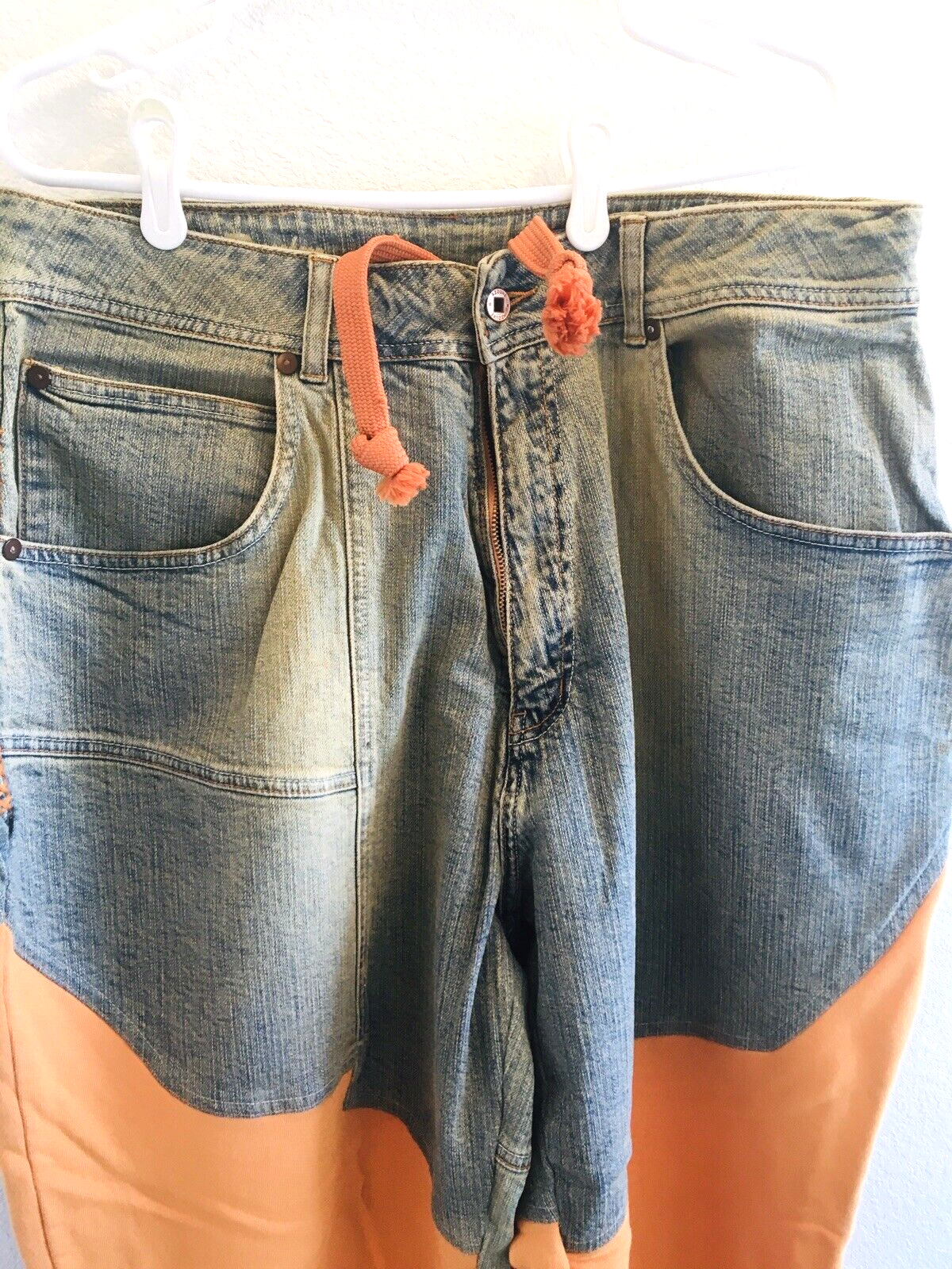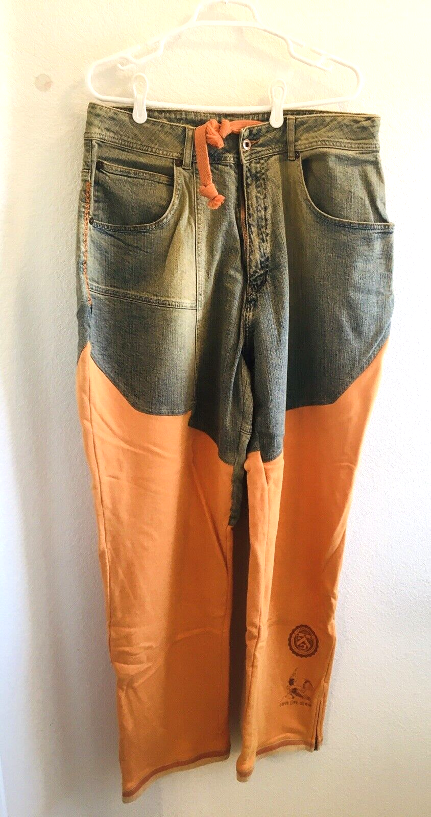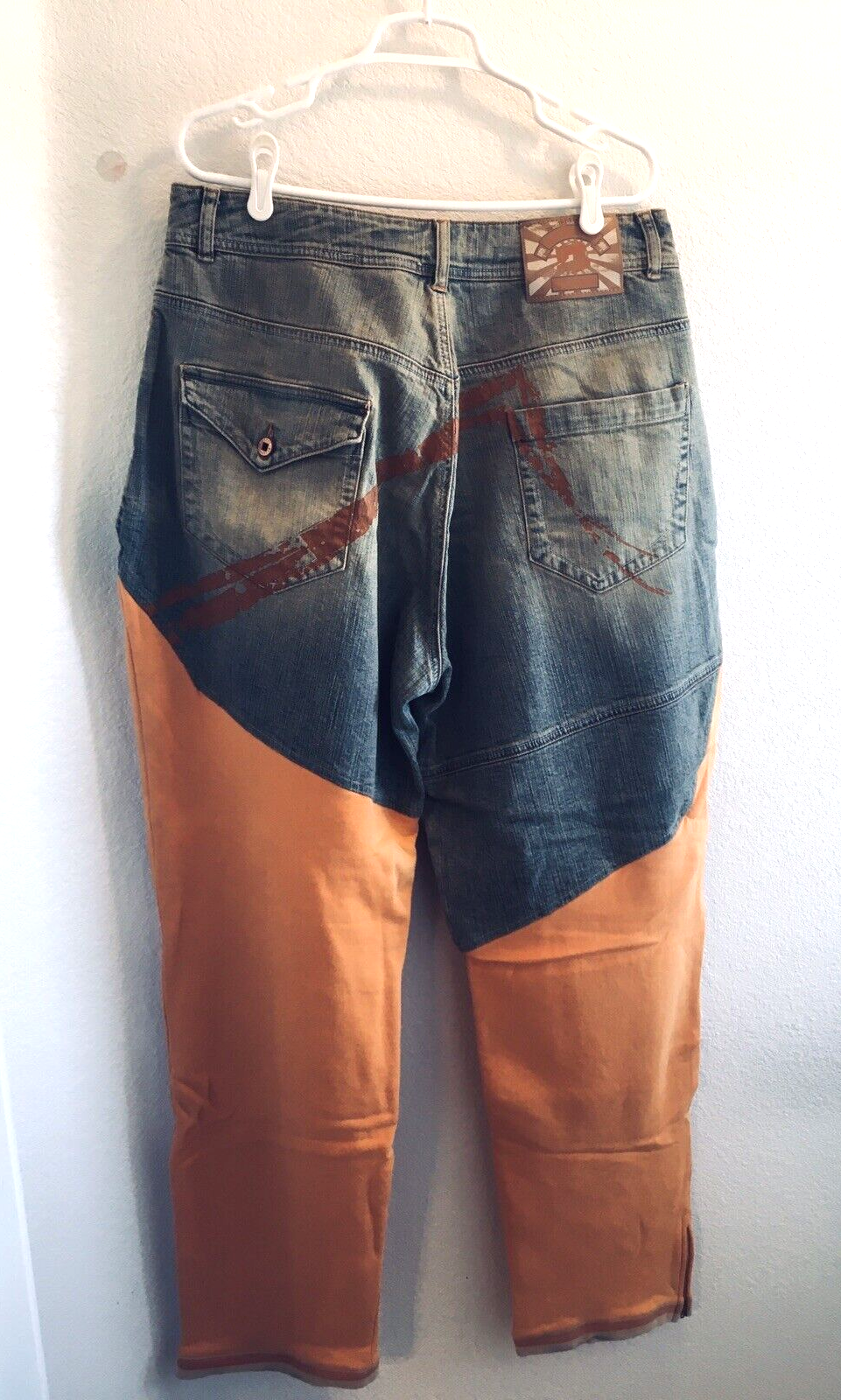Vtg. Azzure Jeans/Jogger Pants Men Size 34" x 33" Zip Leg Hip Hop Culture Multi-Color. The jogger, sweatpants part is a Pumpkin Orange color and the denim part is a Blueish/Gray color. These are truly unique and very comfortable. These I believe are from the mid to late 1990's. Great for traveling/driving/etc. Very nice overall. Bottoms have some light dirt from wearing and stepping...Just needs to be washed. i will leave this up to the buyer. Enjoy!