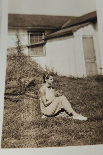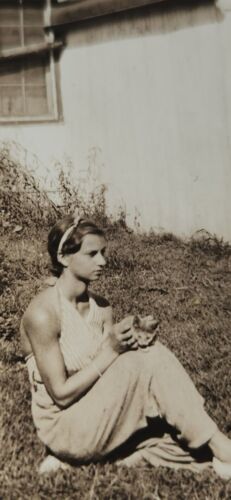 This vintage black and white photograph captures a heartwarming moment of a young girl holding a cat behind her home in the county. The image showcases the girl's affection towards her furry friend and the peaceful surroundings of her home. The photograph depicts a timeless scene that can evoke a sense of nostalgia and warmth in any viewer. This item is a perfect addition to any collector's collection or a great gift for someone who appreciates classic and heartwarming images. Measures 4.5x2.75