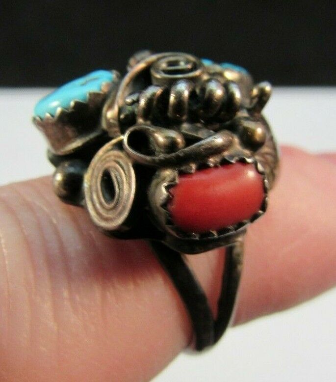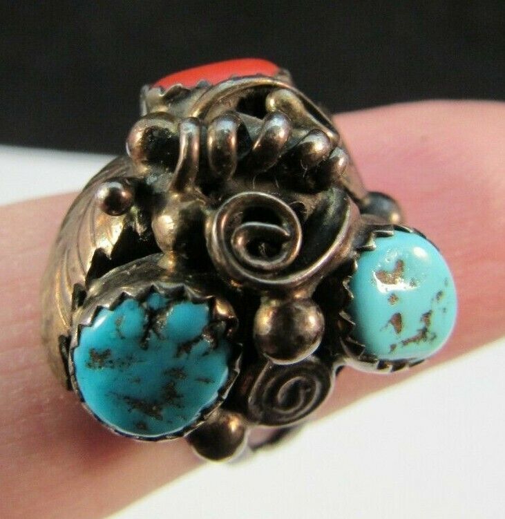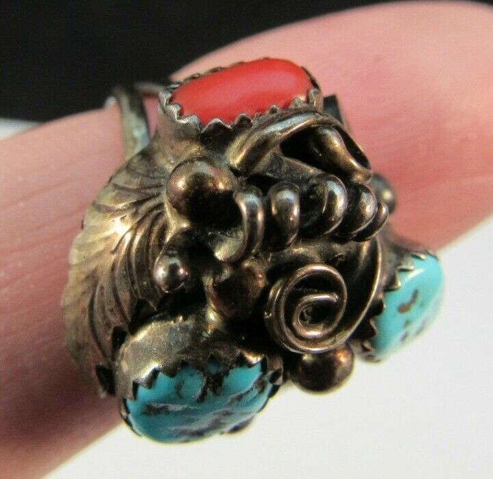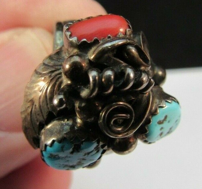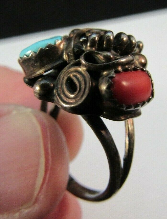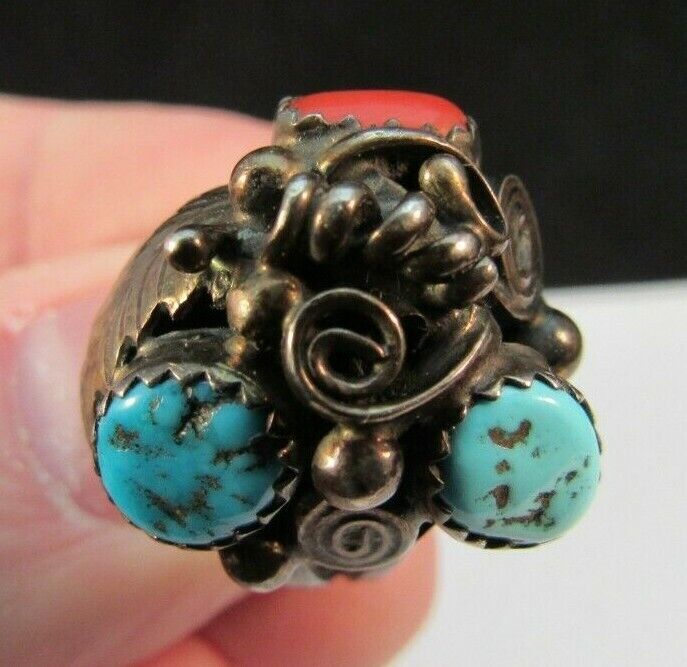 RANDY HOSKIE signed NAVAJO ring STERLING SILVER 925 5.75 6g TURQUOISE & CORAL