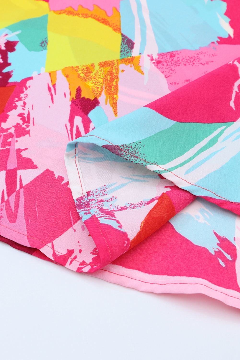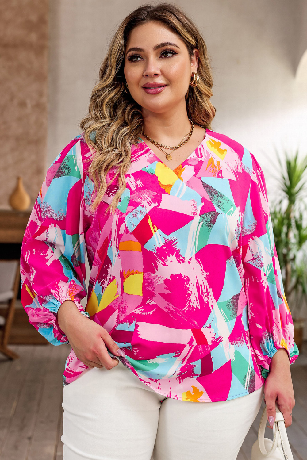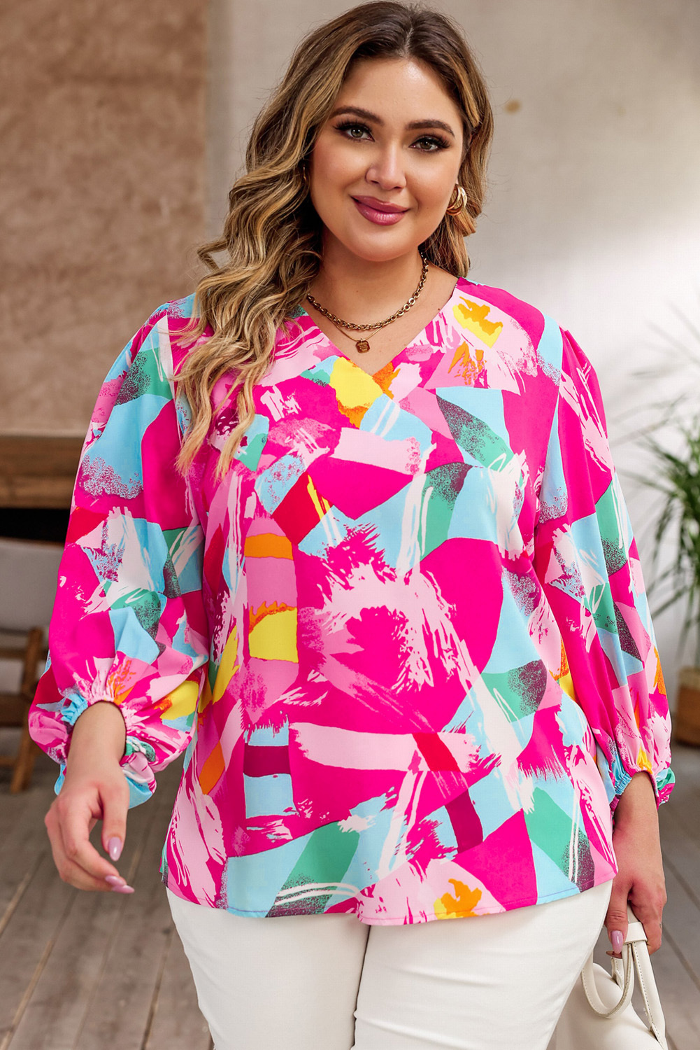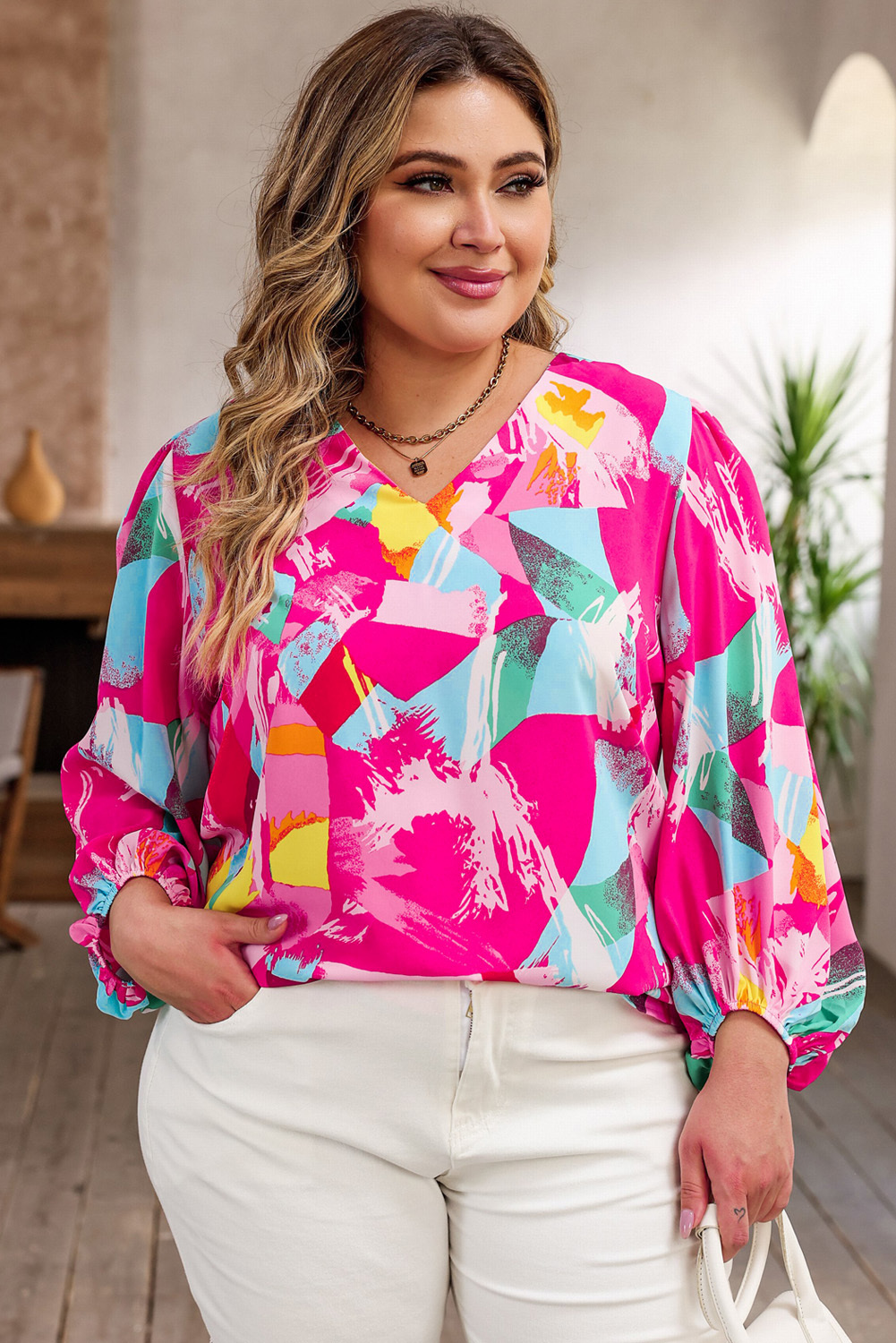 Pink Plus Size Graffiti Print Split Neck Puff Sleeve Blouse