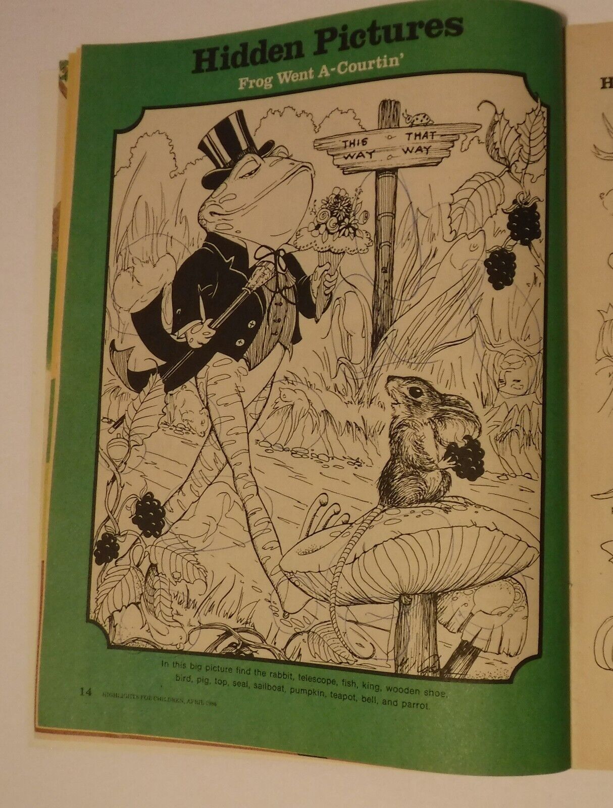 This is an original copy of Highlights for Children Magazine. This is the April 1986 issue. The cover has minor shelf wear. Page 14 has marks, see photo #2. The other pages are clean. There are no missing or torn pages.