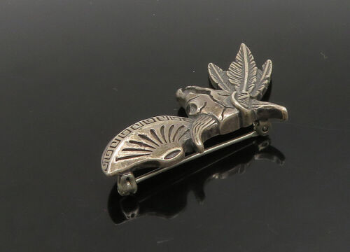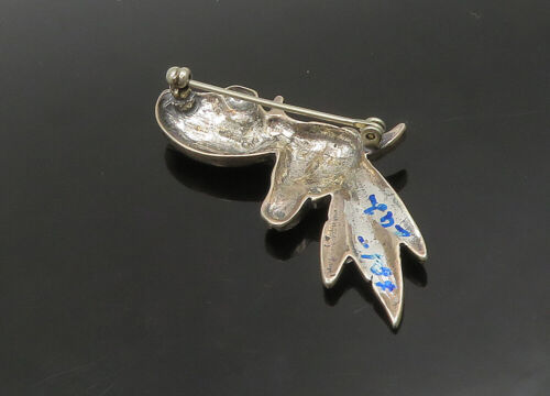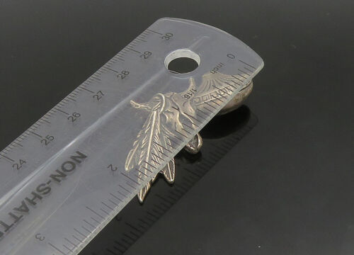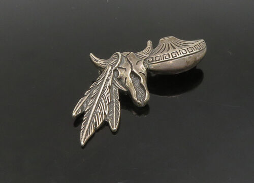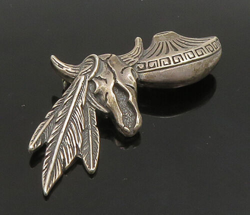 925 Sterling Silver - Vintage Dark Tone Bull Skull & Feathers Brooch Pin- BP9084